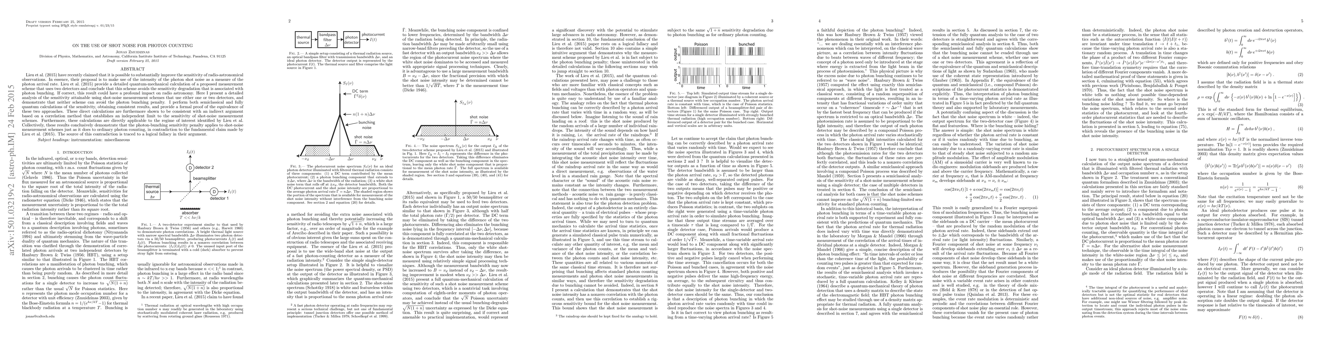 Lieu et al. (2015) have recently claimed that it is possible to substantially improve the sensitivity of radio astronomical observations. In essence, their proposal is to make use of the intensity of the photon shot noise as a measure of the photon arrival rate. Lieu et al. (2015) provide a detailed quantum-mechanical calculation of a proposed measurement scheme that uses two detectors and conclude that this scheme avoids the sensitivity degradation that is associated with photon bunching. If correct, this result could have a profound impact on radio astronomy. Here I present a detailed analysis of the sensitivity attainable using shot-noise measurement schemes that use either one or two detectors, and demonstrate that neither scheme can avoid the photon bunching penalty. I perform both semiclassical and fully quantum calculations of the sensitivity, obtaining consistent results, and provide a formal proof of the equivalence of these two approaches. These direct calculations are furthermore shown to be consistent with an indirect argument based on a correlation method that establishes an independent limit to the sensitivity of shot-noise measurement schemes. Collectively, these results conclusively demonstrate that the photon bunching sensitivity penalty applies to shot noise measurement schemes just as it does to ordinary photon counting, in contradiction to the fundamental claim made by Lieu et al. (2015). The source of this contradiction is traced to a logical fallacy in their argument.