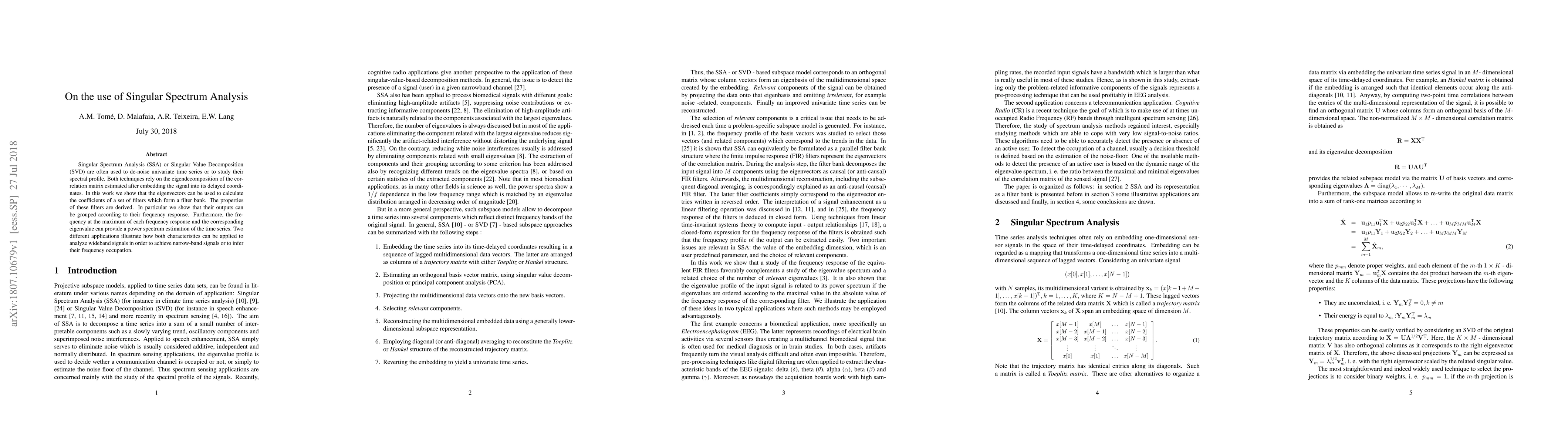 Singular Spectrum Analysis (SSA) or Singular Value Decomposition (SVD) are often used to de-noise univariate time series or to study their spectral profile. Both techniques rely on the eigendecomposition of the cor- relation matrix estimated after embedding the signal into its delayed coordi- nates. In this work we show that the eigenvectors can be used to calculate the coefficients of a set of filters which form a filter bank. The properties of these filters are derived. In particular we show that their outputs can be grouped according to their frequency response. Furthermore, the fre- quency at the maximum of each frequency response and the corresponding eigenvalue can provide a power spectrum estimation of the time series. Two different applications illustrate how both characteristics can be applied to analyze wideband signals in order to achieve narrow-band signals or to infer their frequency occupation.