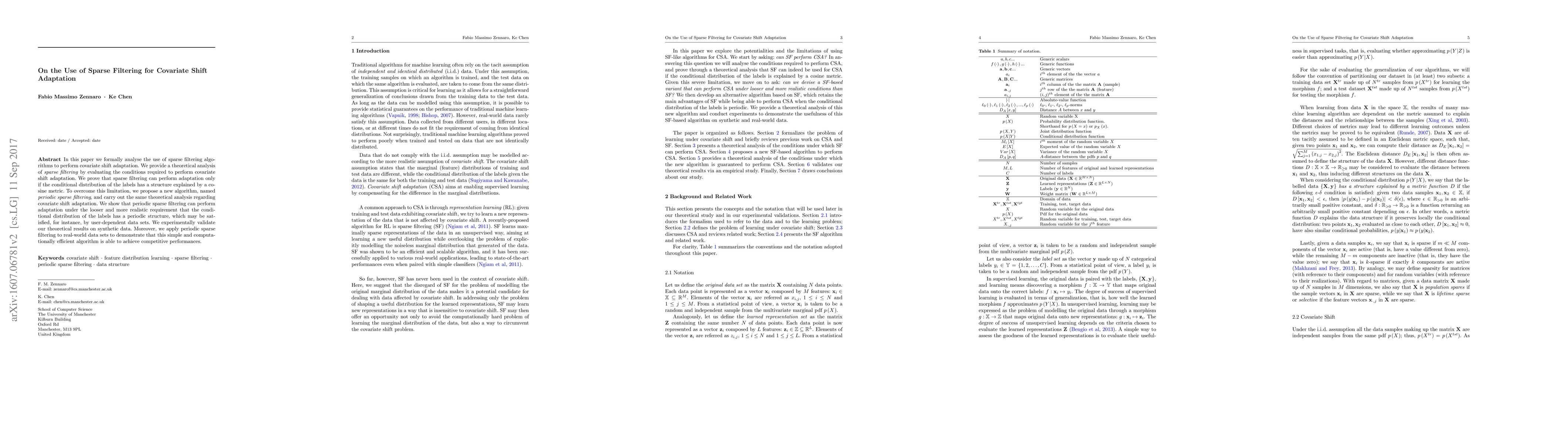 This paper analyzes the use of sparse filtering for covariate shift adaptation, proving its effectiveness under specific conditions. It introduces a new periodic sparse filtering algorithm that adapts to more realistic, periodic label distributions, validated both theoretically and experimentally on both synthetic and real-world datasets.
