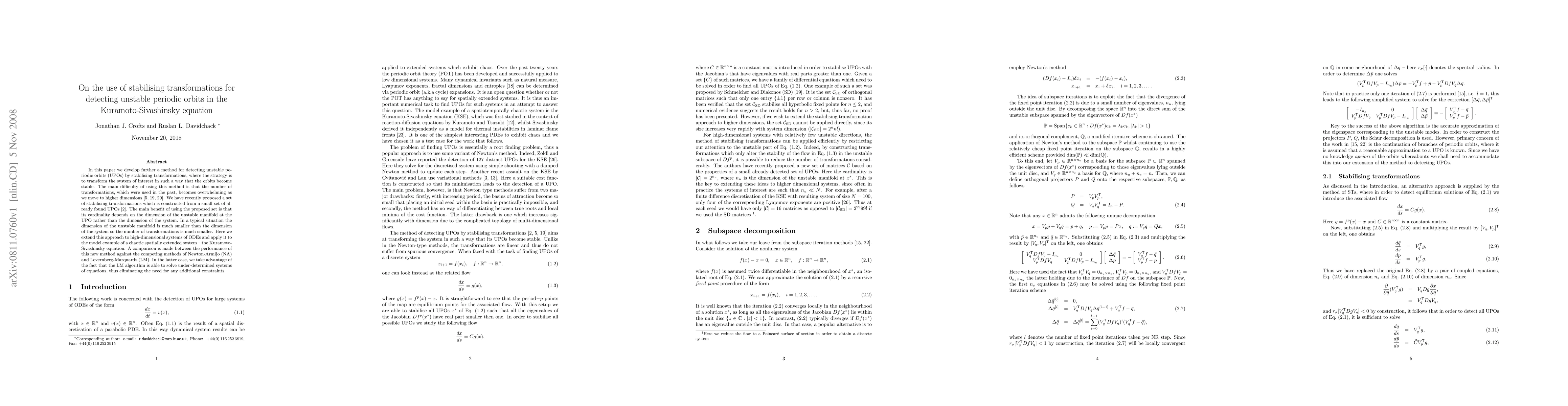 In this paper we develop further a method for detecting unstable periodic orbits (UPOs) by stabilising transformations, where the strategy is to transform the system of interest in such a way that the orbits become stable. The main difficulty of using this method is that the number of transformations, which were used in the past, becomes overwhelming as we move to higher dimensions (Davidchack and Lai 1999; Schmelcher et al. 1997, 1998). We have recently proposed a set of stabilising transformations which is constructed from a small set of already found UPOs (Crofts and Davidchack 2006). The main benefit of using the proposed set is that its cardinality depends on the dimension of the unstable manifold at the UPO rather than the dimension of the system. In a typical situation the dimension of the unstable manifold is much smaller than the dimension of the system so the number of transformations is much smaller. Here we extend this approach to high-dimensional systems of ODEs and apply it to the model example of a chaotic spatially extended system -- the Kuramoto-Sivashinsky equation. A comparison is made between the performance of this new method against the competing methods of Newton-Armijo (NA) and Levernberg-Marquardt (LM). In the latter case, we take advantage of the fact that the LM algorithm is able to solve under-determined systems of equations, thus eliminating the need for any additional constraints.