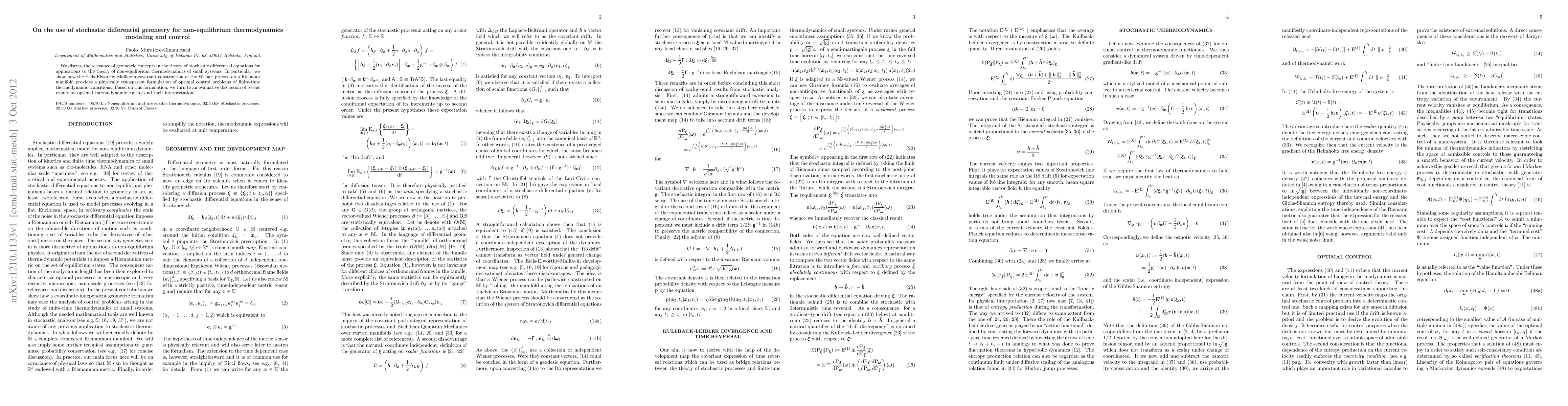 We discuss the relevance of geometric concepts in the theory of stochastic differential equations for applications to the theory of non-equilibrium thermodynamics of small systems. In particular, we show how the Eells-Elworthy-Malliavin covariant construction of the Wiener process on a Riemann manifold provides a physically transparent formulation of optimal control problems of finite-time thermodynamic transitions. Based on this formulation, we turn to an evaluative discussion of recent results on optimal thermodynamic control and their interpretation.