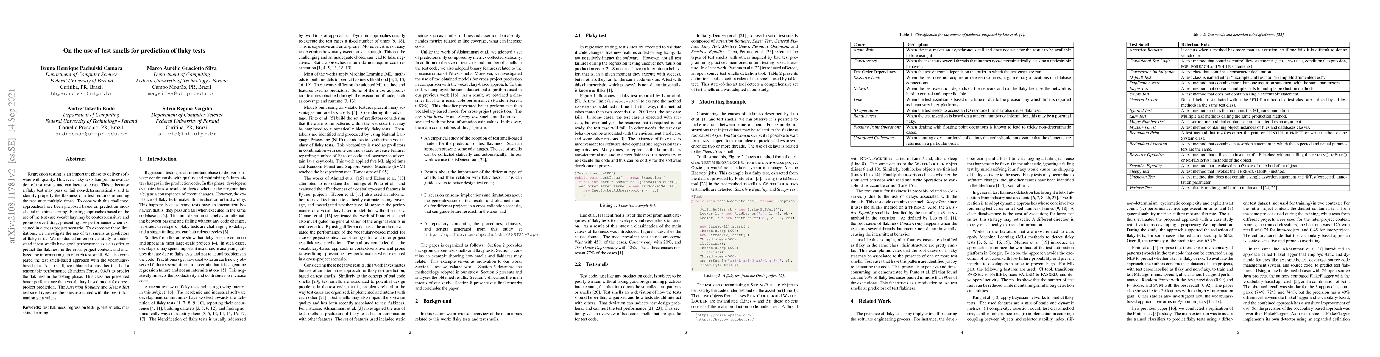 This paper investigates using test smells to predict flaky tests, finding that a classifier based on test smells (Random Forest, 0.83) outperforms vocabulary-based models for cross-project prediction, with Assertion Roulette and Sleepy Test being the most informative test smells.