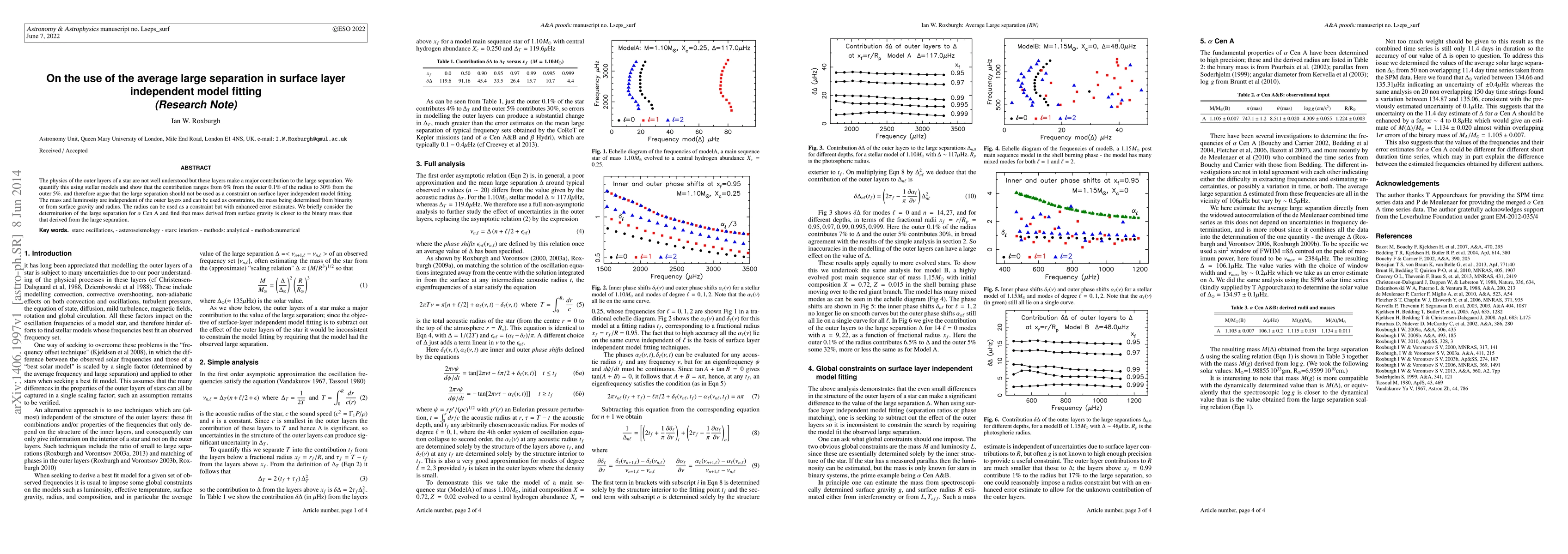 The physics of the outer layers of a star are not well understood but these layers make a major contribution to the large separation. We quantify this using stellar models and show that the contribution ranges from 6\% from the outer 0.1\% of the radius to 30\% from the outer 5\%. and therefore argue that the large separation should not be used as a constraint on surface layer independent model fitting. The mass and luminosity are independent of the outer layers and can be used as constraints, the mass being determined from binarity or from surface gravity and radius. The radius can be used as a constraint but with enhanced error estimates. We briefly consider the determination of the large separation for $\alpha$ Cen A and find that mass derived from surface gravity is closer to the binary mass than that derived from the large separation.