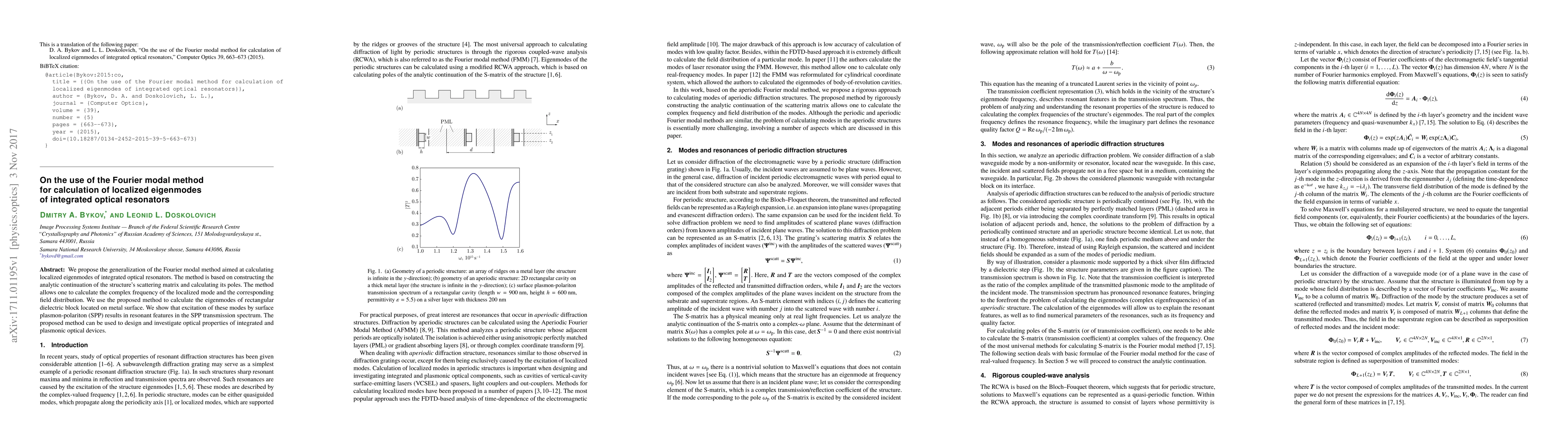 This paper proposes a generalized Fourier modal method for calculating localized eigenmodes in integrated optical resonators, based on the analytic continuation of the structure's scattering matrix and its poles. The method is demonstrated on rectangular dielectric blocks on metal surfaces, showing resonant features in the SPP transmission spectrum upon excitation.