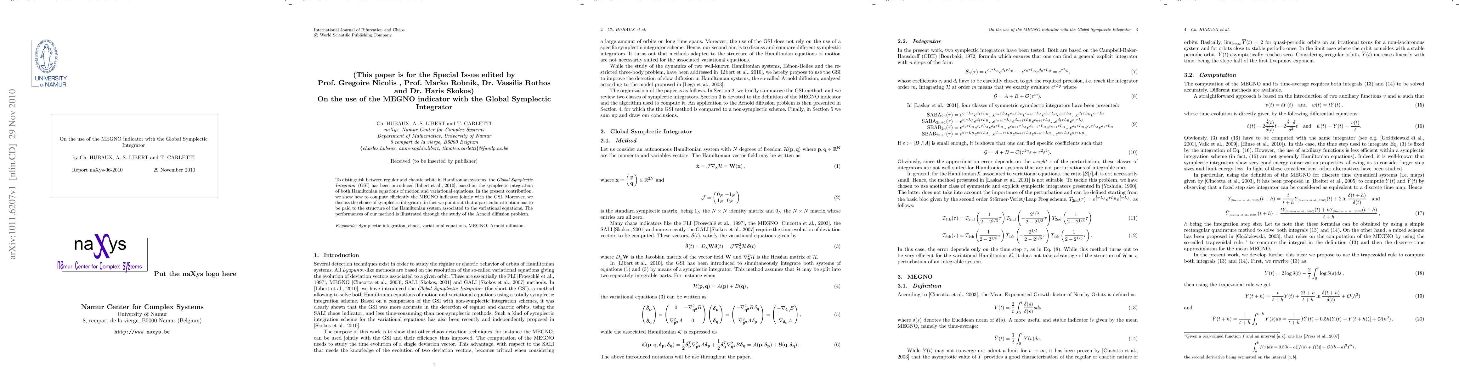 To distinguish between regular and chaotic orbits in Hamiltonian systems, the Global Symplectic Integrator (GSI) has been introduced, based on the symplectic integration of both Hamiltonian equations of motion and variational equations. In the present contribution, we show how to compute efficiently the MEGNO indicator jointly with the GSI. Moreover, we discuss the choice of symplectic integrator, in fact we point out that a particular attention has to be paid to the structure of the Hamiltonian system associated to the variational equations. The performances of our method is illustrated through the study of the Arnold diffusion problem.