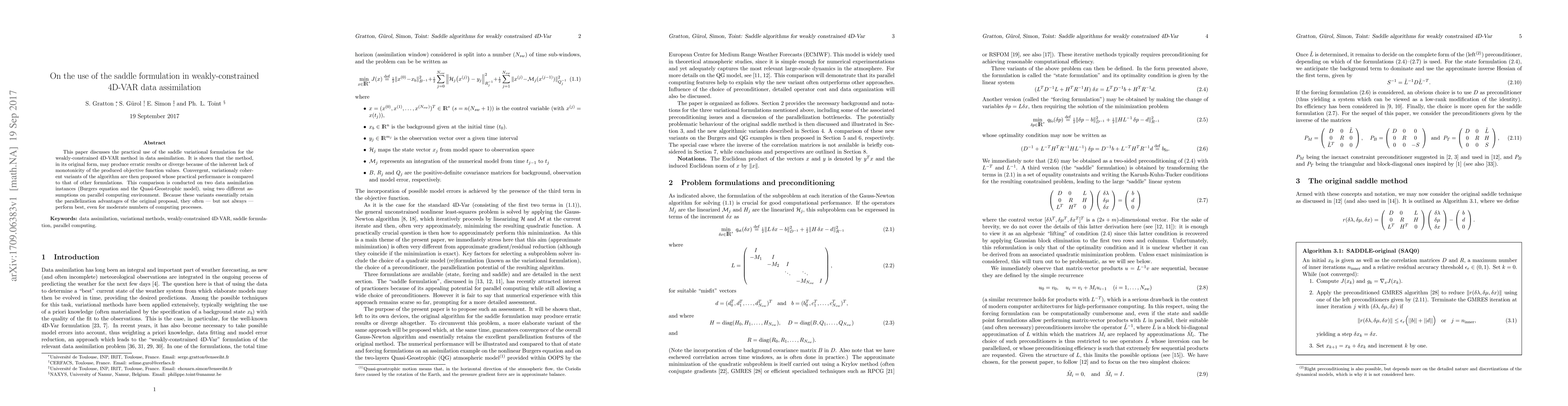 This paper explores the saddle variational formulation for weakly-constrained 4D-VAR data assimilation, addressing its erratic results and proposing convergent variants. Performance comparisons show these variants often outperform others while maintaining parallelization benefits.