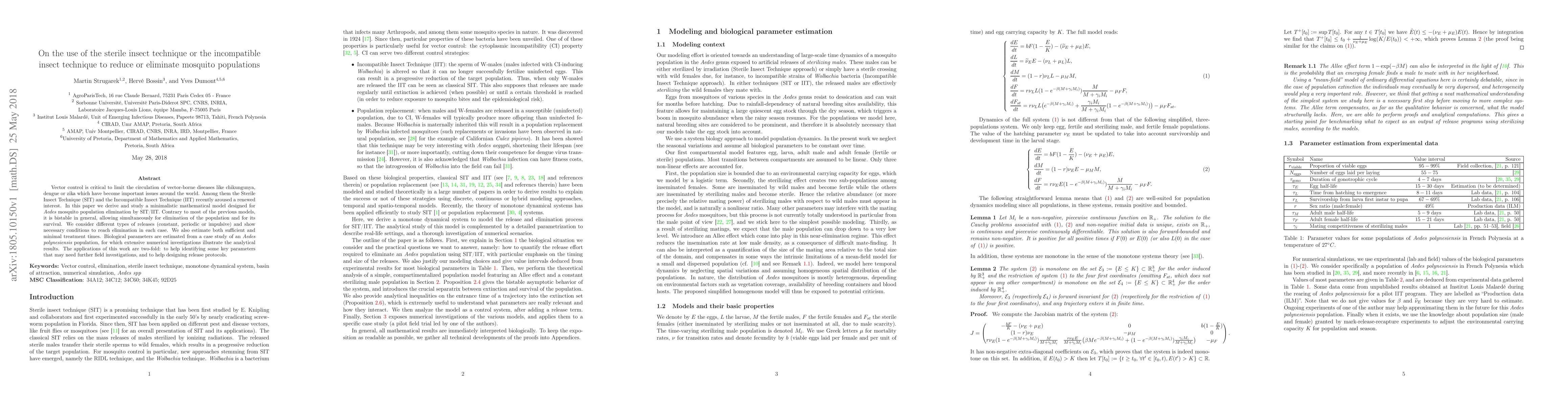 Vector control is critical to limit the circulation of vector-borne diseases like chikungunya, dengue or zika which have become important issues around the world. Among them the Sterile Insect Technique (SIT) and the Incompatible Insect Technique (IIT) recently aroused a renewed interest. In this paper we derive and study a minimalistic mathematical model designed for Aedes mosquito population elimination by SIT/IIT. Contrary to most of the previous models, it is bistable in general, allowing simultaneously for elimination of the population and for its survival. We consider dierent types of releases (constant, periodic or impulsive) and show necessary conditions to reach elimination in each case. We also estimate both sucient and minimal treatment times. Biological parameters are estimated from a case study of an Aedes polynesiensis population, for which extensive numerical investigations illustrate the analytical results. The applications of this work are twofold: to help identifying some key parameters that may need further eld investigations, and to help designing release protocols.