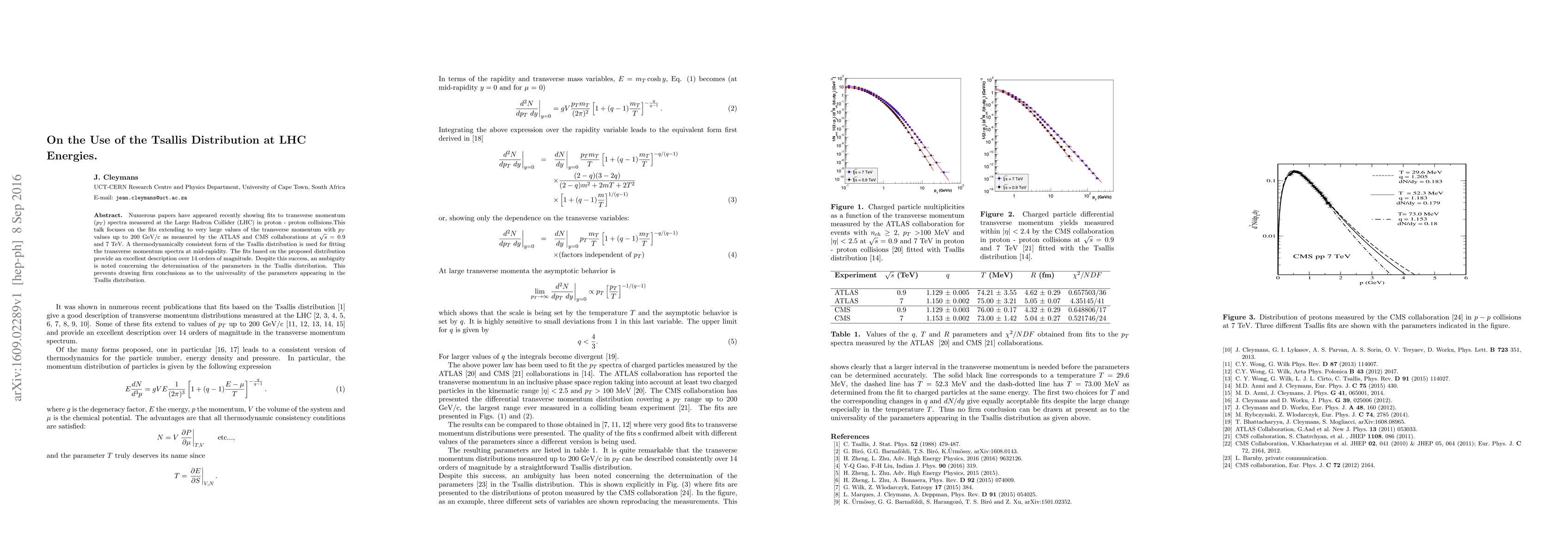 Numerous papers have appeared recently showing fits to transverse momentum ($p_T$) spectra measured at the Large Hadron Collider (LHC) in proton - proton collisions.This talk focuses on the fits extending to very large values of the transverse momentum with $p_T$ values up to 200 GeV/c as measured by the ATLAS and CMS collaborations at $\sqrt{s}$ = 0.9 and 7 TeV. A thermodynamically consistent form of the Tsallis distribution is used for fitting the transverse momentum spectra at mid-rapidity. The fits based on the proposed distribution provide an excellent description over 14 orders of magnitude. Despite this success, an ambiguity is noted concerning the determination of the parameters in the Tsallis distribution. This prevents drawing firm conclusions as to the universality of the parameters appearing in the Tsallis distribution.