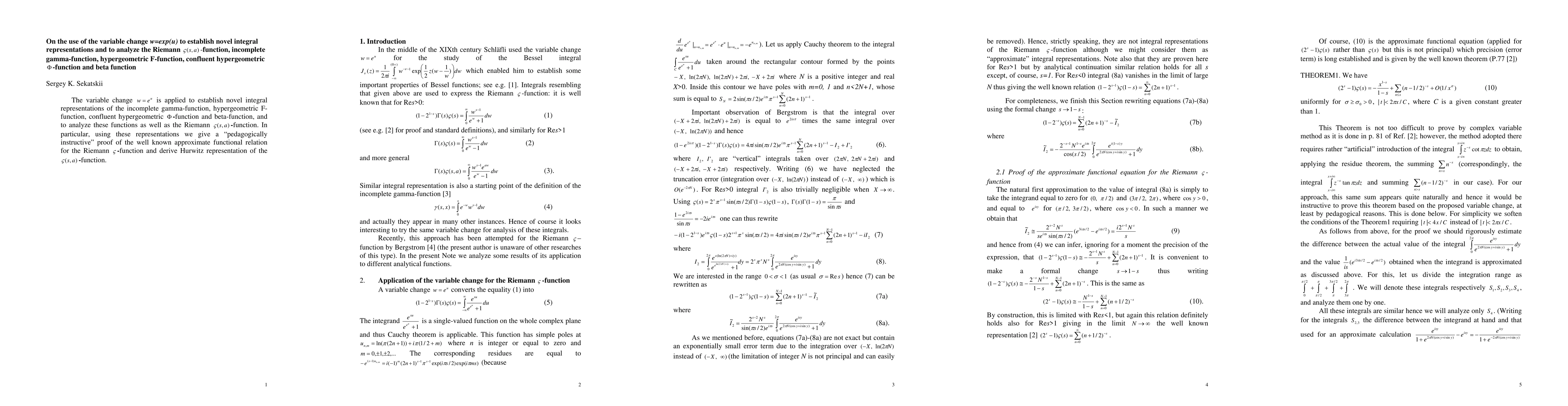 Summary: The paper utilizes the variable change \( w = \exp(u) \) to develop new integral representations for the incomplete gamma function, hypergeometric function, confluent hypergeometric Phi-function, beta function, and the Riemann zeta function. It also provides an instructive proof of an approximate functional relation for the Riemann zeta function and derives the Hurwitz representation of the zeta function.