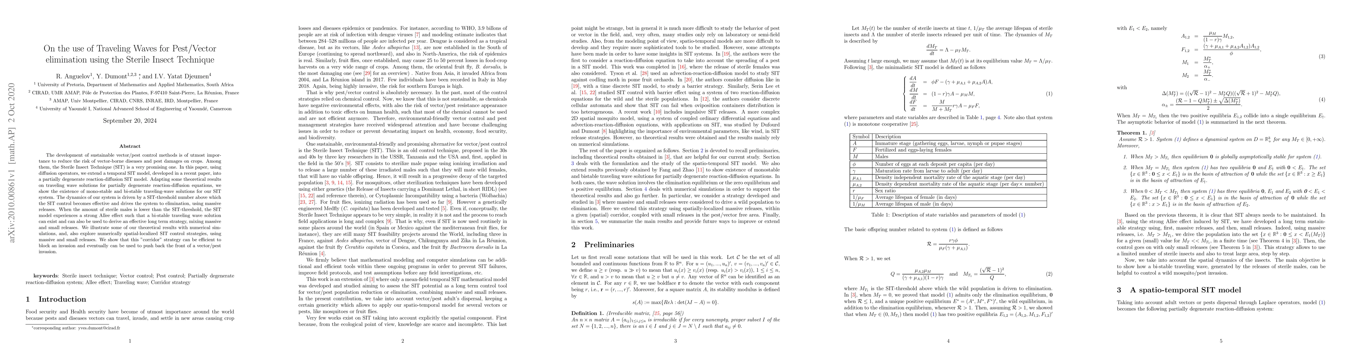 This paper explores the use of the Sterile Insect Technique (SIT) for pest/vector elimination through traveling waves, extending a temporal SIT model into a partially degenerate reaction-diffusion system. It demonstrates the existence of mono-stable and bi-stable traveling waves and proposes a "corridor" strategy combining massive and small releases to block and push back invasions.