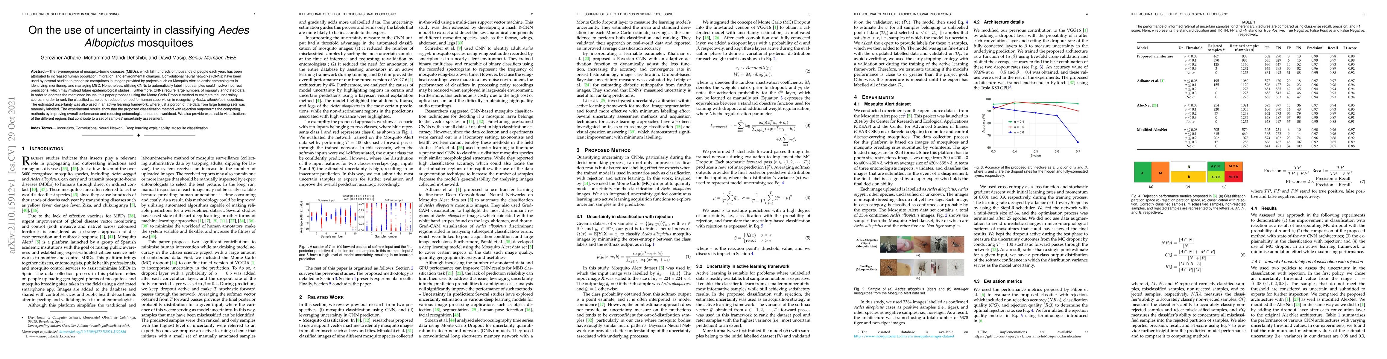 The re-emergence of mosquito-borne diseases (MBDs), which kill hundreds of thousands of people each year, has been attributed to increased human population, migration, and environmental changes. Convolutional neural networks (CNNs) have been used by several studies to recognise mosquitoes in images provided by projects such as Mosquito Alert to assist entomologists in identifying, monitoring, and managing MBD. Nonetheless, utilising CNNs to automatically label input samples could involve incorrect predictions, which may mislead future epidemiological studies. Furthermore, CNNs require large numbers of manually annotated data. In order to address the mentioned issues, this paper proposes using the Monte Carlo Dropout method to estimate the uncertainty scores in order to rank the classified samples to reduce the need for human supervision in recognising Aedes albopictus mosquitoes. The estimated uncertainty was also used in an active learning framework, where just a portion of the data from large training sets was manually labelled. The experimental results show that the proposed classification method with rejection outperforms the competing methods by improving overall performance and reducing entomologist annotation workload. We also provide explainable visualisations of the different regions that contribute to a set of samples' uncertainty assessment.