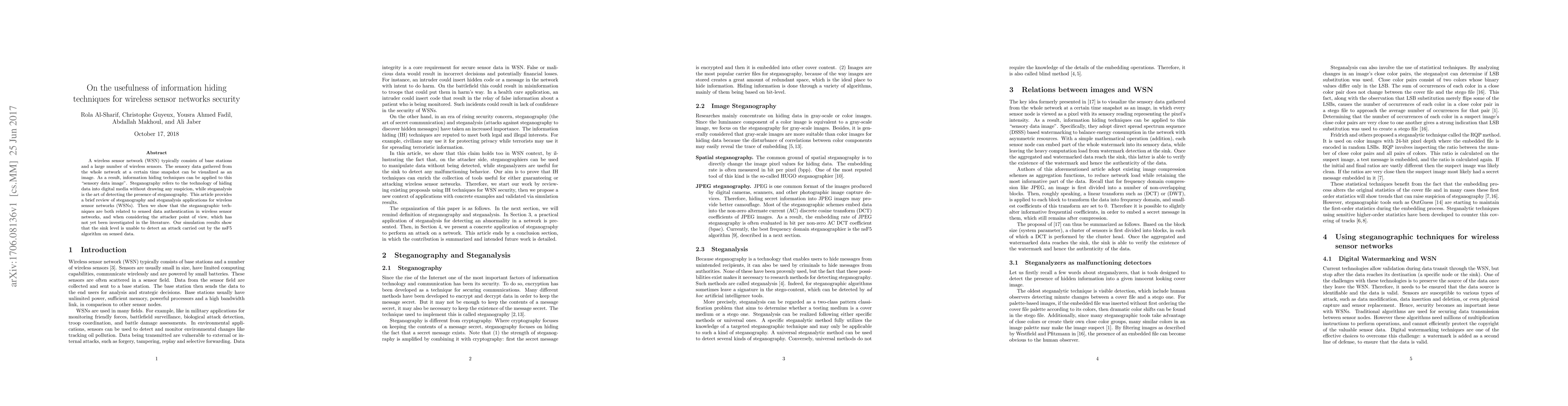 Researchers explored the application of information hiding techniques to secure wireless sensor networks through steganography and steganalysis. Their simulation results showed that attacks on sensed data can evade detection by the sink level.