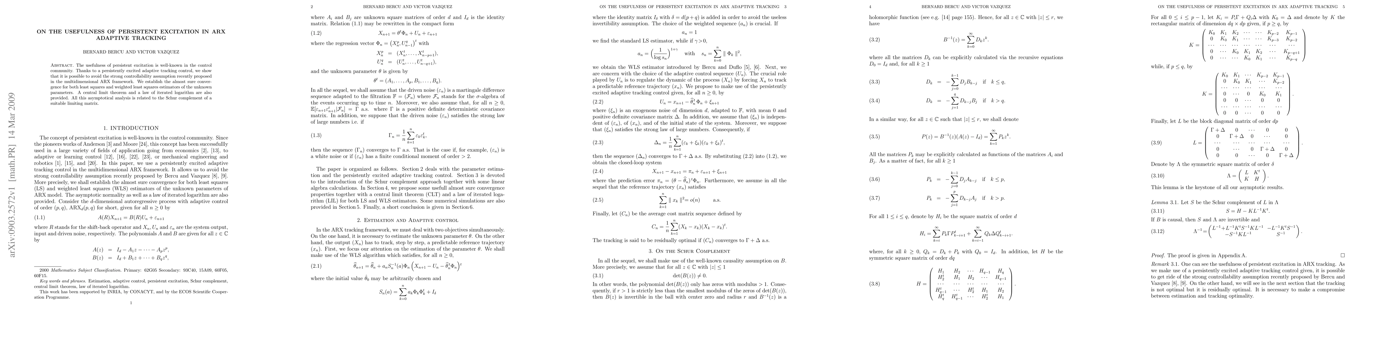 This paper demonstrates the utility of persistent excitation in ARX adaptive tracking, showing it can bypass stringent controllability assumptions in multidimensional ARX systems. It establishes almost sure convergence for least squares and weighted least squares estimators, along with a central limit theorem and a law of iterated logarithm, all tied to the Schur complement of a limiting matrix.