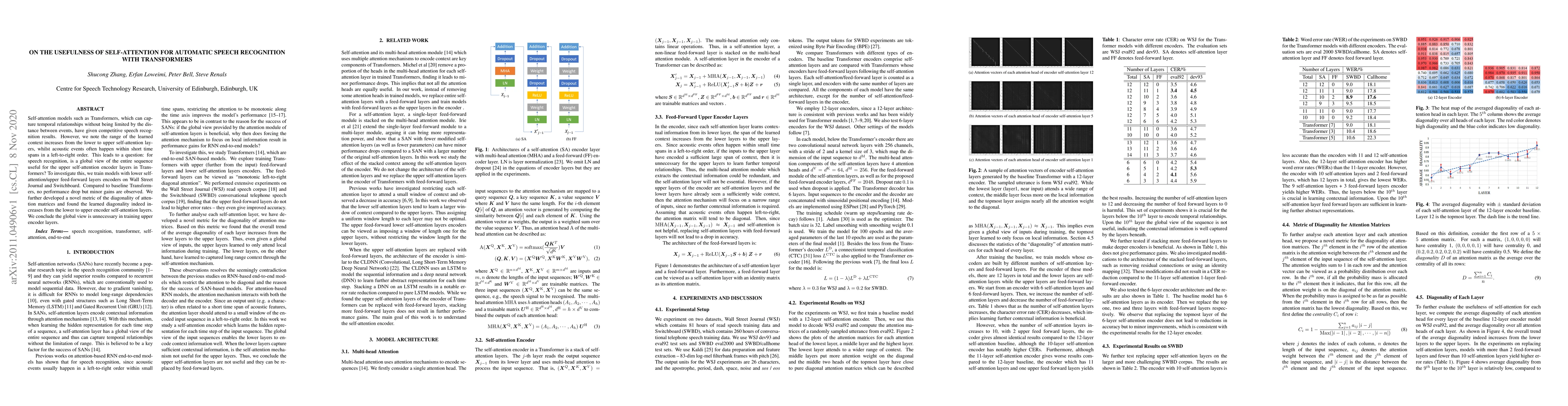 Self-attention models such as Transformers, which can capture temporal relationships without being limited by the distance between events, have given competitive speech recognition results. However, we note the range of the learned context increases from the lower to upper self-attention layers, whilst acoustic events often happen within short time spans in a left-to-right order. This leads to a question: for speech recognition, is a global view of the entire sequence useful for the upper self-attention encoder layers in Transformers? To investigate this, we train models with lower self-attention/upper feed-forward layers encoders on Wall Street Journal and Switchboard. Compared to baseline Transformers, no performance drop but minor gains are observed. We further developed a novel metric of the diagonality of attention matrices and found the learned diagonality indeed increases from the lower to upper encoder self-attention layers. We conclude the global view is unnecessary in training upper encoder layers.