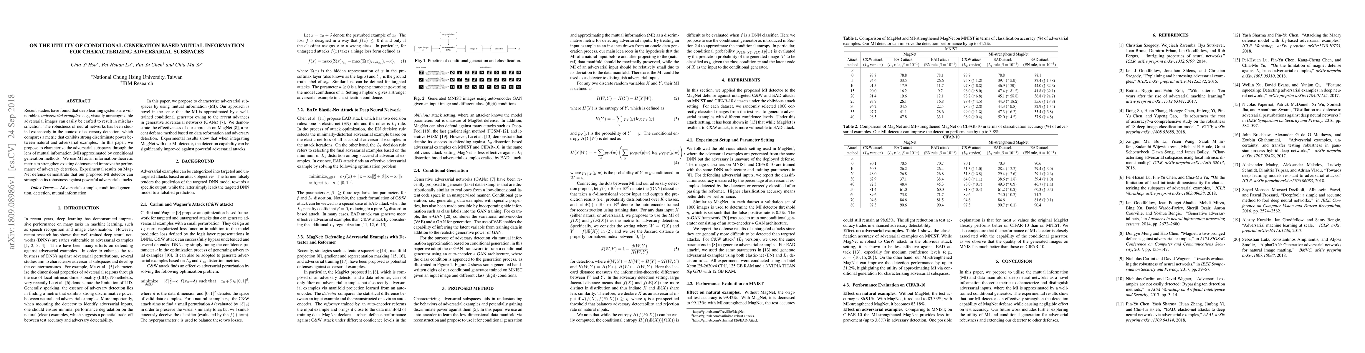 Recent studies have found that deep learning systems are vulnerable to adversarial examples; e.g., visually unrecognizable adversarial images can easily be crafted to result in misclassification. The robustness of neural networks has been studied extensively in the context of adversary detection, which compares a metric that exhibits strong discriminate power between natural and adversarial examples. In this paper, we propose to characterize the adversarial subspaces through the lens of mutual information (MI) approximated by conditional generation methods. We use MI as an information-theoretic metric to strengthen existing defenses and improve the performance of adversary detection. Experimental results on MagNet defense demonstrate that our proposed MI detector can strengthen its robustness against powerful adversarial attacks.