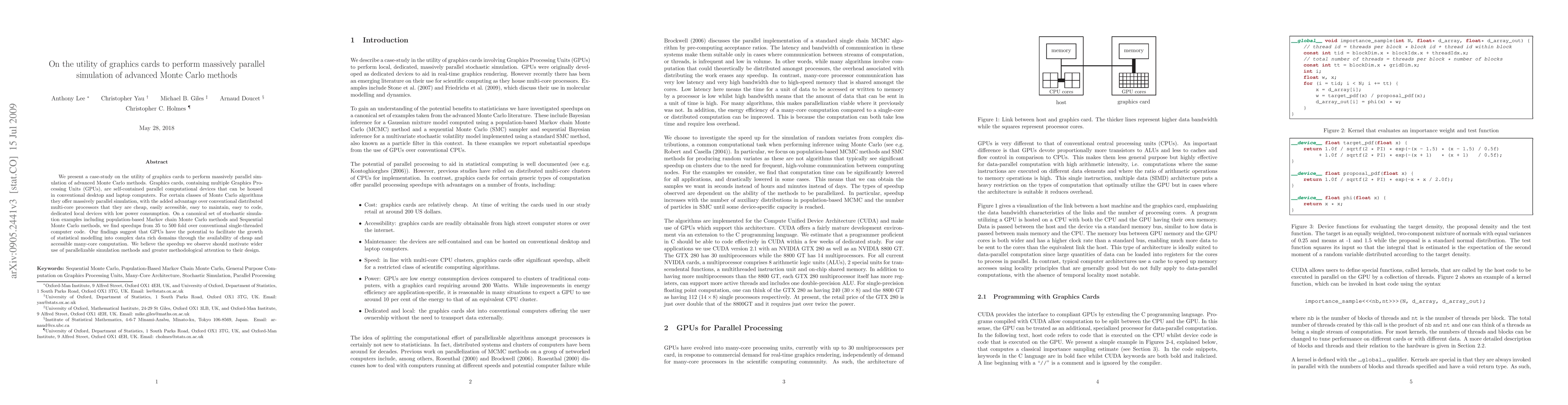 This paper investigates the utility of graphics cards (GPUs) for massively parallel simulation of advanced Monte Carlo methods, finding significant speedups (35 to 500 times) compared to conventional processors, highlighting GPUs as accessible, low-power alternatives for complex statistical modeling.