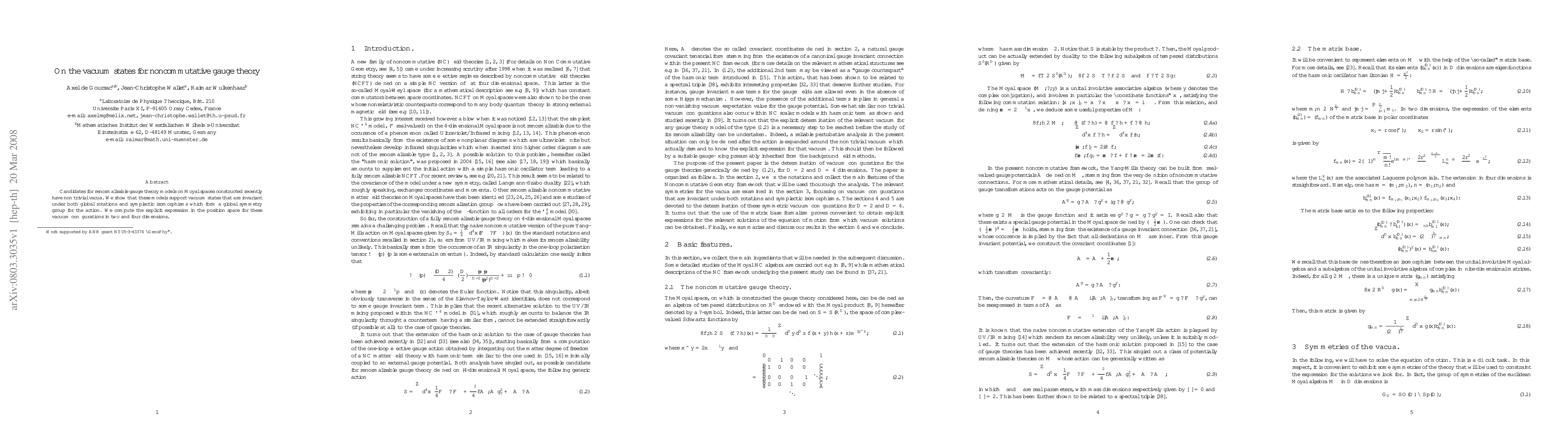 This paper investigates renormalizable gauge theories on Moyal spaces, demonstrating that they possess non-trivial vacuum states invariant under global rotations and symplectic isomorphisms. Explicit expressions for these vacuum configurations are computed in two and four dimensions.