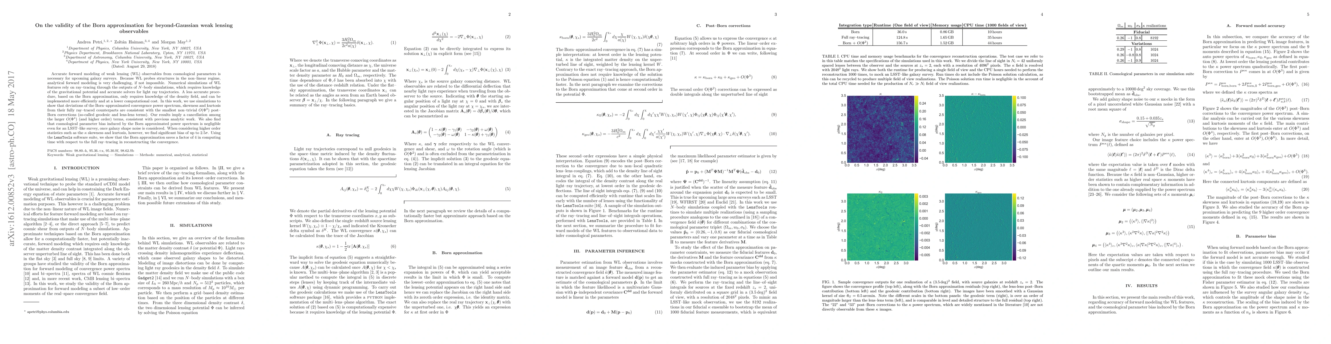Accurate forward modeling of weak lensing (WL) observables from cosmological parameters is necessary for upcoming galaxy surveys. Because WL probes structures in the non-linear regime, analytical forward modeling is very challenging, if not impossible. Numerical simulations of WL features rely on ray-tracing through the outputs of $N$-body simulations, which requires knowledge of the gravitational potential and accurate solvers for light ray trajectories. A less accurate procedure, based on the Born approximation, only requires knowledge of the density field, and can be implemented more efficiently and at a lower computational cost. In this work, we use simulations to show that deviations of the Born-approximated convergence power spectrum, skewness and kurtosis from their fully ray--traced counterparts are consistent with the smallest non-trivial $O(\Phi^3)$ post-Born corrections (so-called geodesic and lens-lens terms). Our results imply a cancellation among the larger $O(\Phi^4)$ (and higher order) terms, consistent with previous analytic work. We also find that cosmological parameter bias induced by the Born approximated power spectrum is negligible even for an LSST-like survey, once galaxy shape noise is considered. When considering higher order statistics such as the $\kappa$ skewness and kurtosis, however, we find significant bias of up to 2.5$\sigma$. Using the LensTools software suite, we show that the Born approximation saves a factor of 4 in computing time with respect to the full ray-tracing in reconstructing the convergence.