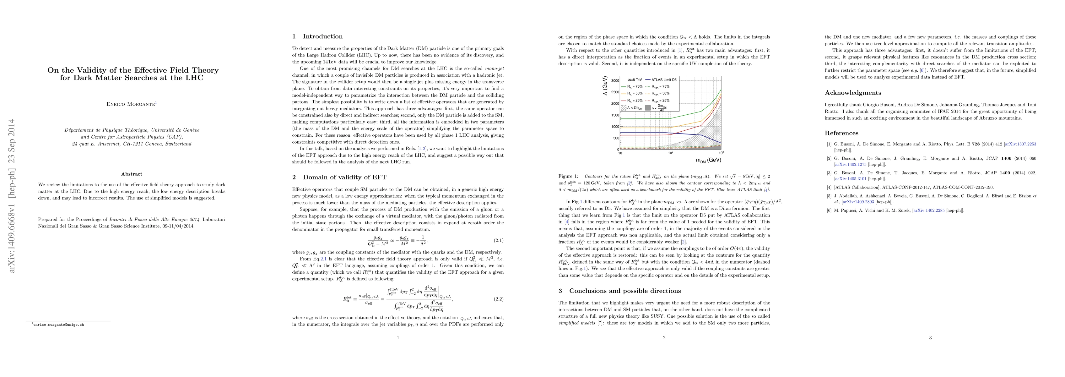We review the limitations to the use of the effective field theory approach to study dark matter at the LHC. Due to the high energy reach, the low energy description breaks down, and may lead to incorrect results. The use of simplified models is suggested.