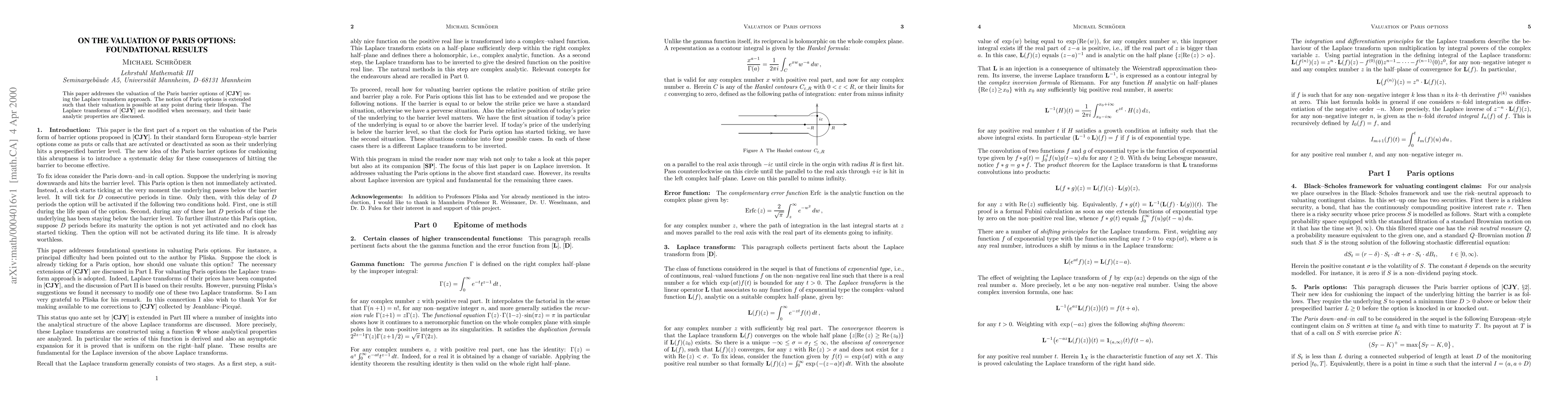 This paper adresses the valuation of the Paris barrier options proposed by Yor, Jeanblanc-Picque, and Chesnay (Advances in Applied Probability, 29(1997), 165-184) using the Laplace transform approach. Based on suggestions by Pliska the notion of Paris options is extended such that their valuation is possible at any point during their lifespan. The Laplace transforms derived by Yor et al. are modified when necessary, and their basic analytic properties are discussed.