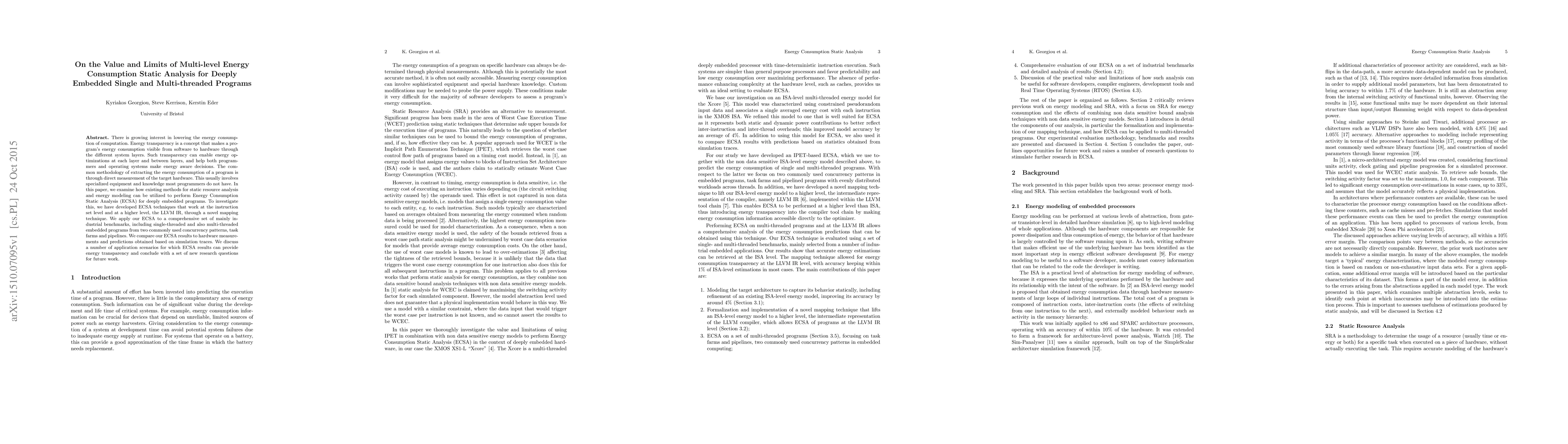 This paper explores the application of static analysis techniques to estimate energy consumption in embedded single and multi-threaded programs, comparing these estimates to actual hardware measurements. It introduces a novel mapping technique to perform Energy Consumption Static Analysis (ECSA) at both instruction set and LLVM IR levels.
