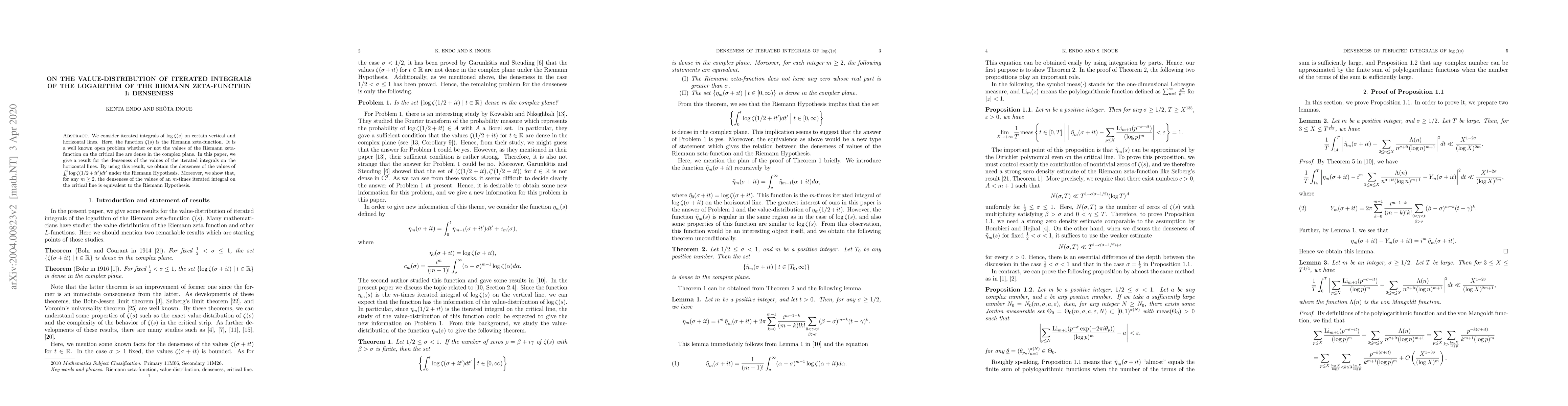 We consider iterated integrals of $\log\zeta(s)$ on certain vertical and horizontal lines. Here, the function $\zeta(s)$ is the Riemann zeta-function. It is a well known open problem whether or not the values of the Riemann zeta-function on the critical line are dense in the complex plane. In this paper, we give a result for the denseness of the values of the iterated integrals on the horizontal lines. By using this result, we obtain the denseness of the values of $\int_{0}^{t} \log \zeta(1/2 + it')dt'$ under the Riemann Hypothesis. Moreover, we show that, for any $m\geq 2$, the denseness of the values of an $m$-times iterated integral on the critical line is equivalent to the Riemann Hypothesis.