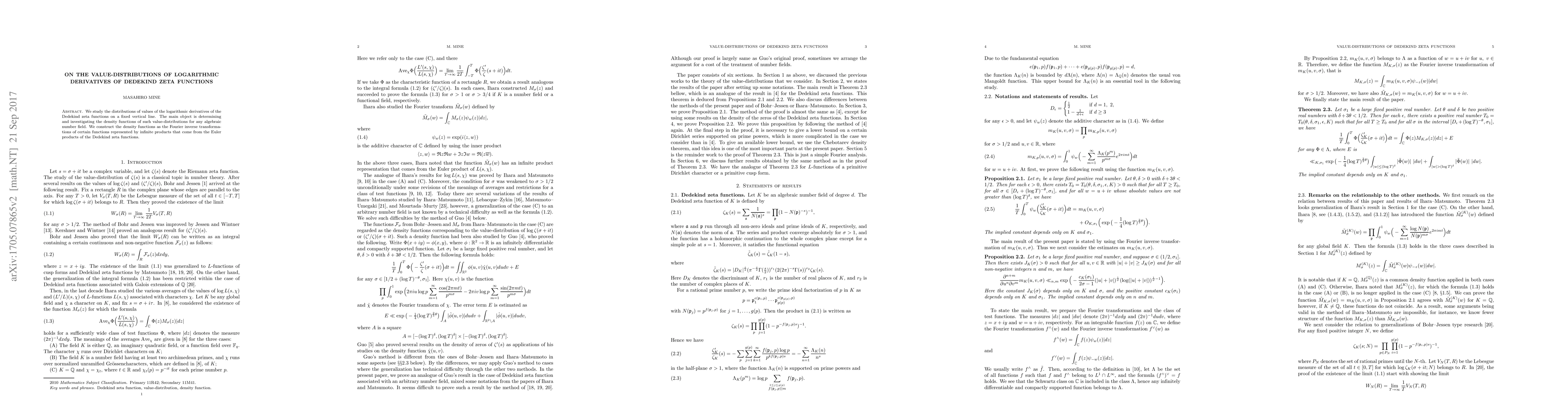This paper investigates the value-distributions of logarithmic derivatives of Dedekind zeta functions along a fixed vertical line, constructing density functions via Fourier inverse transformations derived from Euler products of these zeta functions. The study aims to determine these distributions for any algebraic number field.