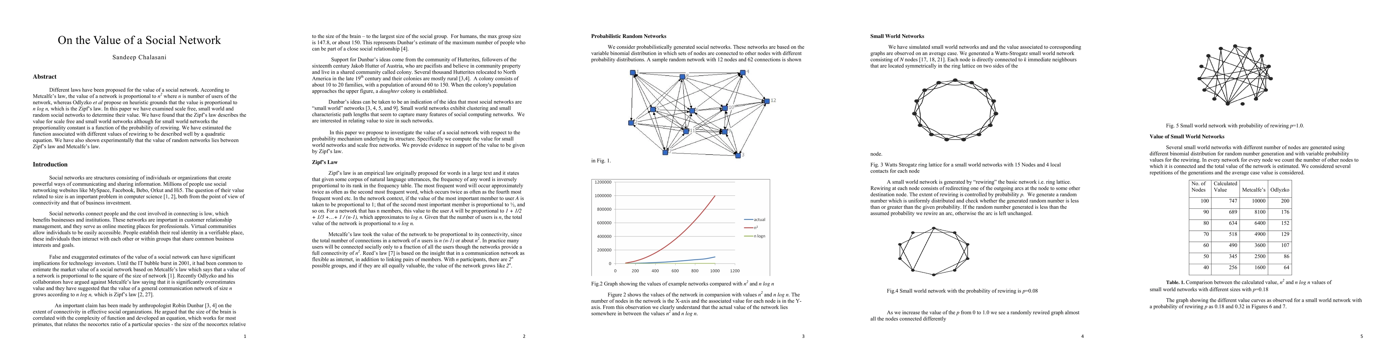 This research paper calculates the value of social networks, specifically small world and scale-free types, finding support for Zipf's law. It employs computational methods to back its claims.