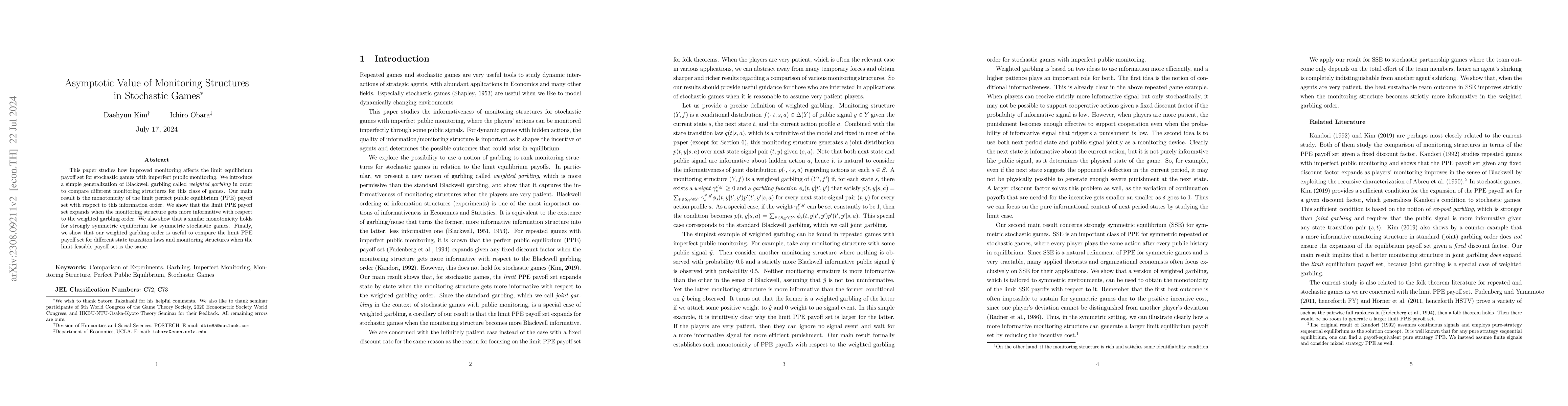 This paper studies how improved monitoring affects the limit equilibrium payoff set for stochastic games with imperfect public monitoring. We introduce a simple generalization of Blackwell garbling called weighted garbling in order to compare different information structures for this class of games. Our main result is the monotonicity of the limit perfect public equilibrium (PPE) payoff set with respect to this information order: we show that the limit PPE payoff sets with one information structure is larger than the limit PPE payoff sets with another information structure state by state if the latter information structure is a weighted garbling of the former. We show that this monotonicity result also holds for the class of strongly symmetric equilibrium. Finally, we introduce and discuss another weaker sufficient condition for the expansion of limit PPE payoff set. It is more complex and difficult to verify, but useful in some special cases.