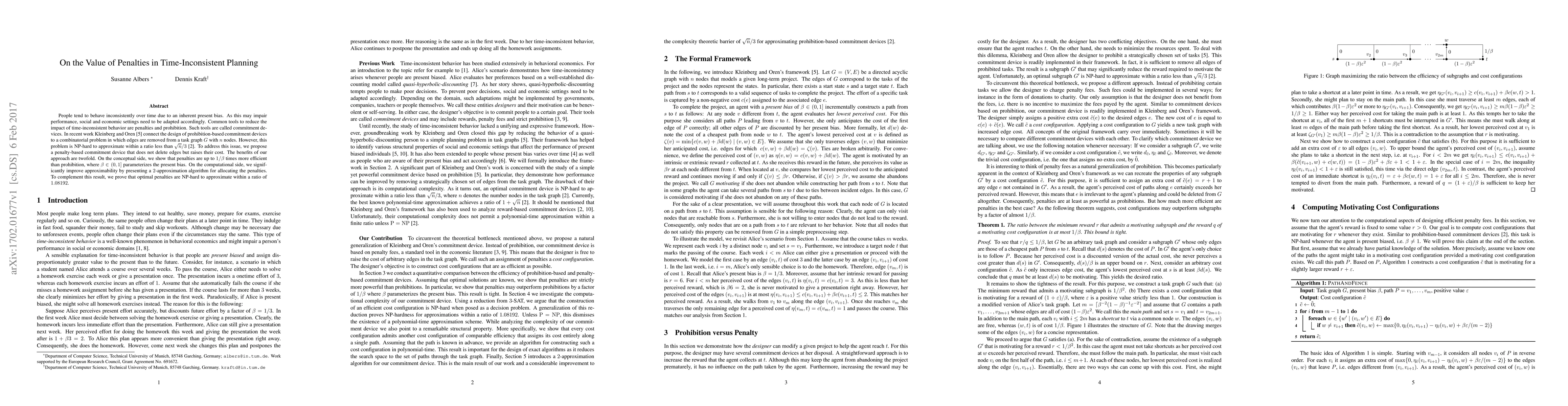 People tend to behave inconsistently over time due to an inherent present bias. As this may impair performance, social and economic settings need to be adapted accordingly. Common tools to reduce the impact of time-inconsistent behavior are penalties and prohibition. Such tools are called commitment devices. In recent work Kleinberg and Oren connect the design of prohibition-based commitment devices to a combinatorial problem in which edges are removed from a task graph $G$ with $n$ nodes. However, this problem is NP-hard to approximate within a ratio less than $\sqrt{n}/3$. To address this issue, we propose a penalty-based commitment device that does not delete edges but raises their cost. The benefits of our approach are twofold. On the conceptual side, we show that penalties are up to $1/\beta$ times more efficient than prohibition, where $\beta \in (0,1]$ parameterizes the present bias. On the computational side, we significantly improve approximability by presenting a $2$-approximation algorithm for allocating the penalties. To complement this result, we prove that optimal penalties are NP-hard to approximate within a ratio of $1.08192$.