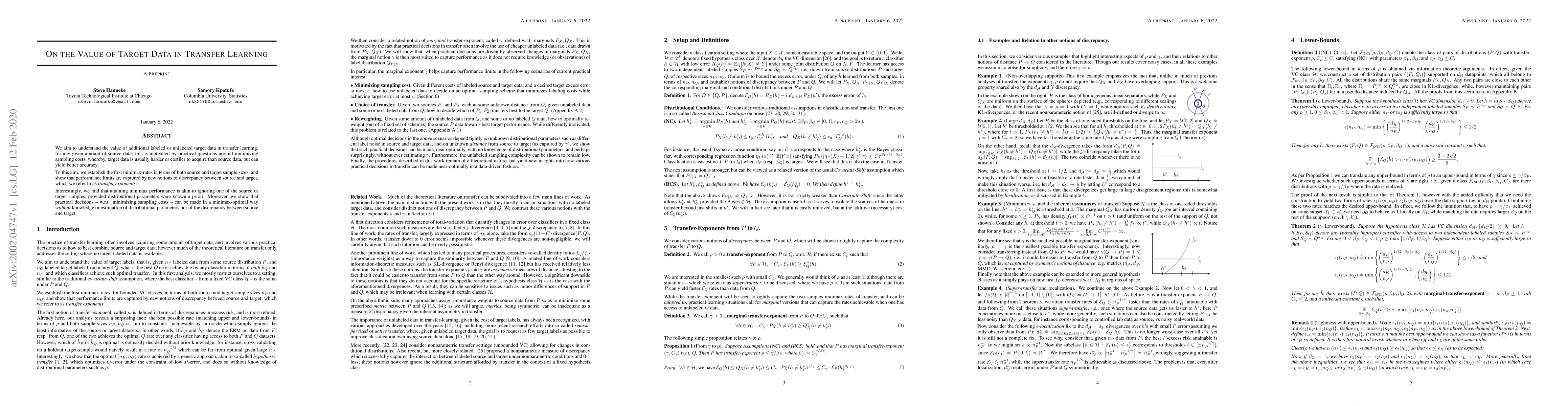 We aim to understand the value of additional labeled or unlabeled target data in transfer learning, for any given amount of source data; this is motivated by practical questions around minimizing sampling costs, whereby, target data is usually harder or costlier to acquire than source data, but can yield better accuracy. To this aim, we establish the first minimax-rates in terms of both source and target sample sizes, and show that performance limits are captured by new notions of discrepancy between source and target, which we refer to as transfer exponents.