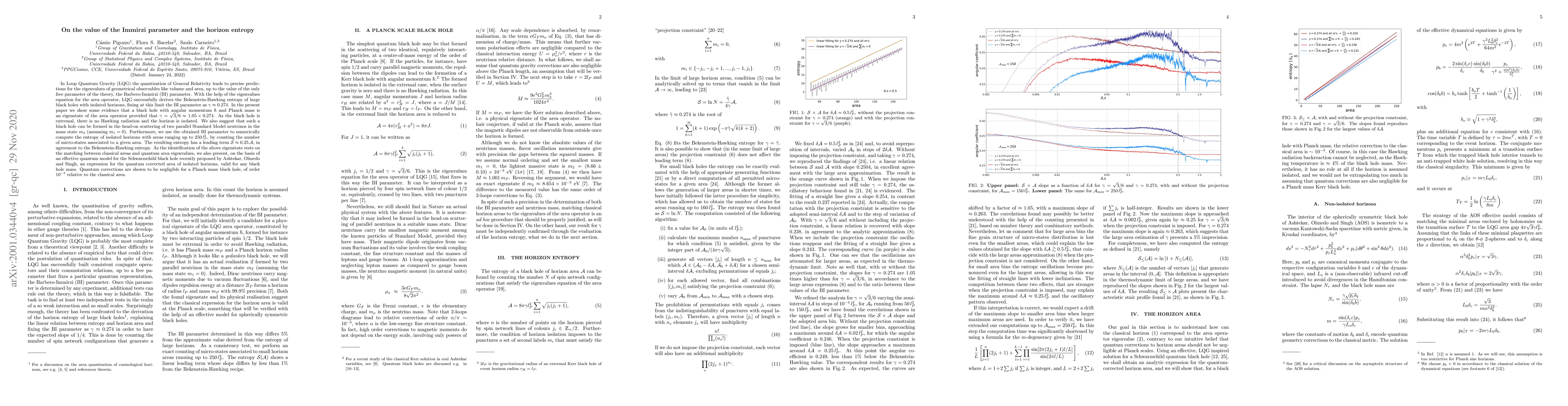 In Loop Quantum Gravity (LQG) the quantisation of General Relativity leads to precise predictions for the eigenvalues of geometrical observables like volume and area, up to the value of the only free parameter of the theory, the Barbero-Immirzi (BI) parameter. With the help of the eigenvalues equation for the area operator, LQG successfully derives the Bekenstein-Hawking entropy of large black holes with isolated horizons, fixing at this limit the BI parameter as $\gamma \approx 0.274$. In the present paper we show some evidence that a black hole with angular momentum $\hbar$ and Planck mass is an eigenstate of the area operator provided that $\gamma = \sqrt{3}/6 \approx 1.05 \times 0.274$. As the black hole is extremal, there is no Hawking radiation and the horizon is isolated. We also suggest that such a black hole can be formed in the head-on scattering of two parallel Standard Model neutrinos in the mass state $m_2$ (assuming $m_1 = 0$). Furthermore, we use the obtained BI parameter to numerically compute the entropy of isolated horizons with areas ranging up to $250\,l_P^2$, by counting the number of micro-states associated to a given area. The resulting entropy has a leading term ${\cal S} \approx 0.25\, {\cal A}$, in agreement to the Bekenstein-Hawking entropy. As the identification of the above eigenstate rests on the matching between classical areas and quantum area eigenvalues, we also present, on the basis of an effective quantum model for the Schwarzschild black hole recently proposed by Ashtekar, Olmedo and Singh, an expression for the quantum corrected area of isolated horizons, valid for any black hole mass. Quantum corrections are shown to be negligible for a Planck mass black hole, of order $10^{-3}$ relative to the classical area.