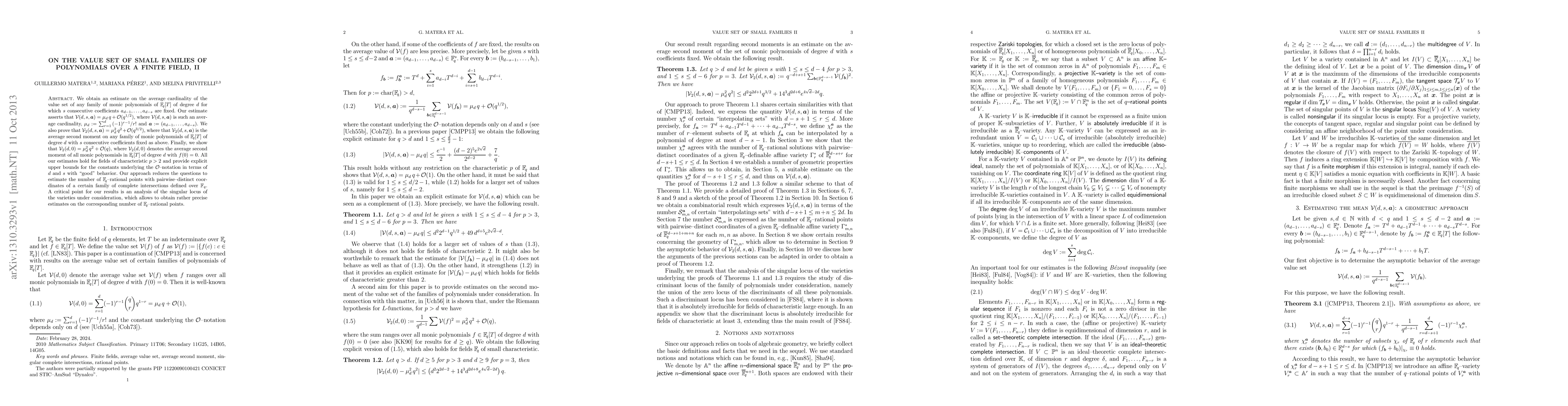 We obtain an estimate on the average cardinality of the value set of any family of monic polynomials of Fq[T] of degree d for which s consecutive coefficients a_{d-1},...,a_{d-s} are fixed. Our estimate asserts that \mathcal{V}(d,s,\bfs{a})=\mu_d\,q+\mathcal{O}(q^{1/2}), where \mathcal{V}(d,s,\bfs{a}) is such an average cardinality, \mu_d:=\sum_{r=1}^d{(-1)^{r-1}}/{r!} and \bfs{a}:=(a_{d-1},...,a_{d-s}). We also prove that \mathcal{V}_2(d,s,\bfs{a})=\mu_d^2\,q^2+\mathcal{O}(q^{3/2}), where that \mathcal{V}_2(d,s,\bfs{a}) is the average second moment on any family of monic polynomials of Fq[T] of degree d with s consecutive coefficients fixed as above. Finally, we show that \mathcal{V}_2(d,0)=\mu_d^2\,q^2+\mathcal{O}(q), where \mathcal{V}_2(d,0) denotes the average second moment of all monic polynomials in Fq[T] of degree d with f(0)=0. All our estimates hold for fields of characteristic p>2 and provide explicit upper bounds for the constants underlying the \mathcal{O}--notation in terms of d and s with "good" behavior. Our approach reduces the questions to estimate the number of Fq--rational points with pairwise--distinct coordinates of a certain family of complete intersections defined over Fq. A critical point for our results is an analysis of the singular locus of the varieties under consideration, which allows to obtain rather precise estimates on the corresponding number of Fq--rational points.
