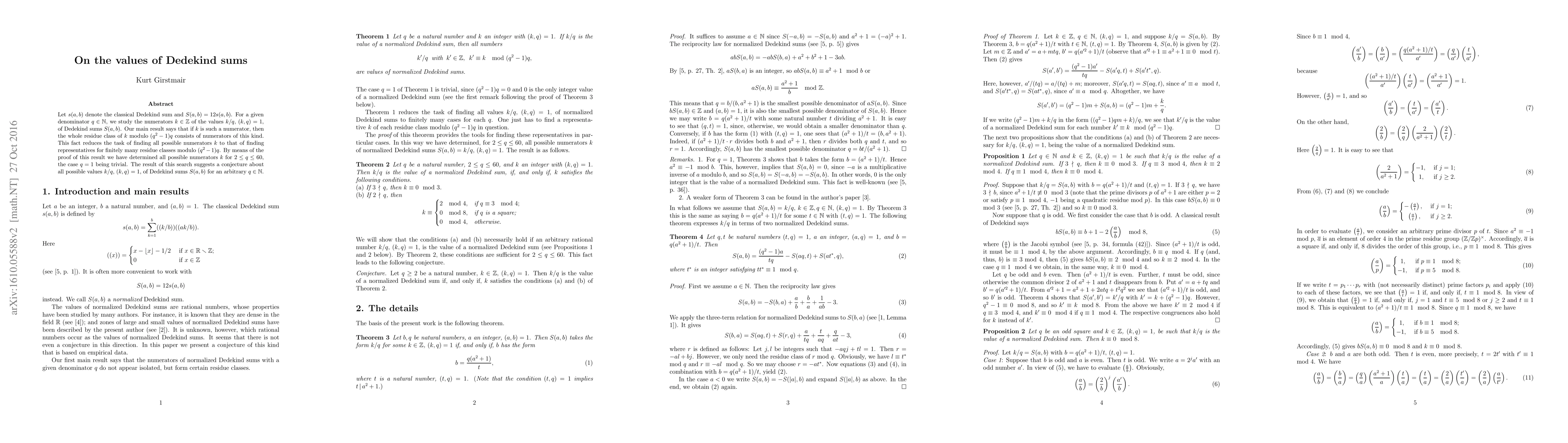 This research studies the numerators of Dedekind sums $S(a,b)$ for given denominators $q$. It reveals that if $k$ is a numerator, then the entire residue class of $k$ modulo $(q^2-1)q$ consists of such numerators, simplifying the search for all possible numerators. The authors determined all numerators for $2\le q\le 50$ and propose a conjecture about the values of $k/q$ for any $q$.