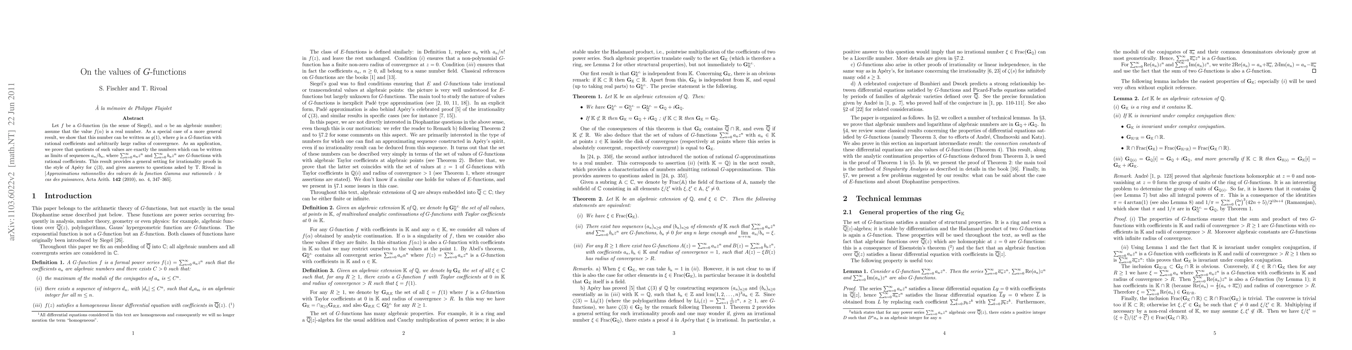 Let f be a G-function (in the sense of Siegel), and x be an algebraic number; assume that the value f(x) is a real number. As a special case of a more general result, we show that f(x) can be written as g(1), where g is a G-function with rational coefficients and arbitrarily large radius of convergence. As an application, we prove that quotients of such values are exactly the numbers which can be written as limits of sequences a(n)/b(n), where the generating series of both sequences are G-functions with rational coefficients. This result provides a general setting for irrationality proofs in the style of Apery for zeta(3), and gives answers to questions asked by T. Rivoal in [Approximations rationnelles des valeurs de la fonction Gamma aux rationnels : le cas des puissances, Acta Arith. 142 (2010), no. 4, 347-365].