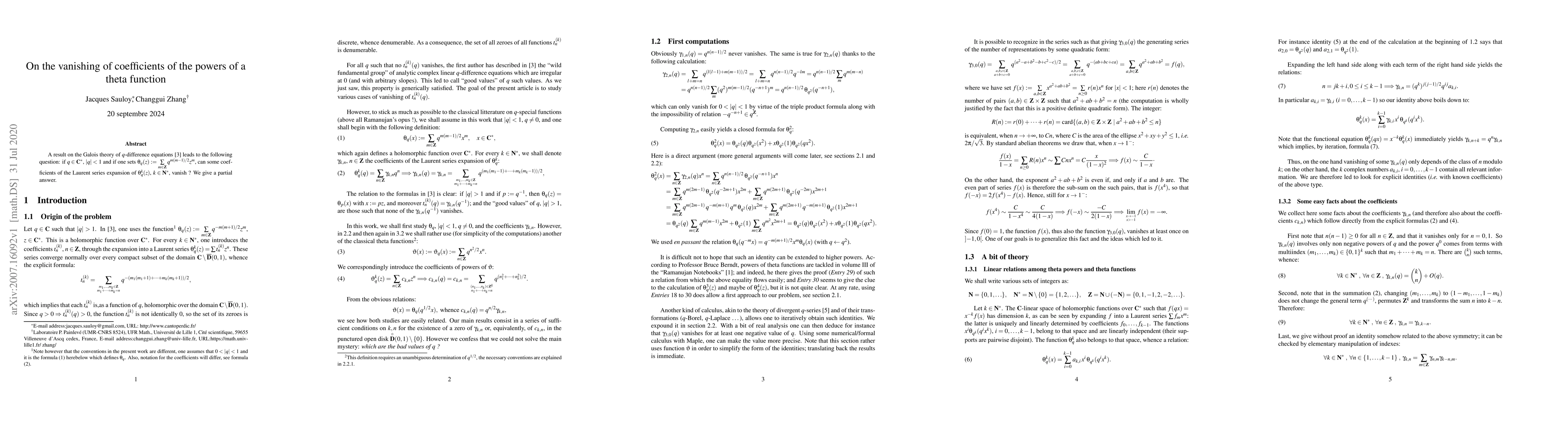A result on the Galois theory of $q$-difference equations \cite{JSTALPAEN} leads to the following question: if $q \in \Cs$, $\lmod q \rmod < 1$ and if one sets $\thq(z) := \sum\limits_{m \in \Z} q^{m(m-1)/2} z^m$, can some coefficients of the Laurent series expansion of $\theta_q^k(z)$, $k \in \N^*$, vanish ? We give a partial answer.