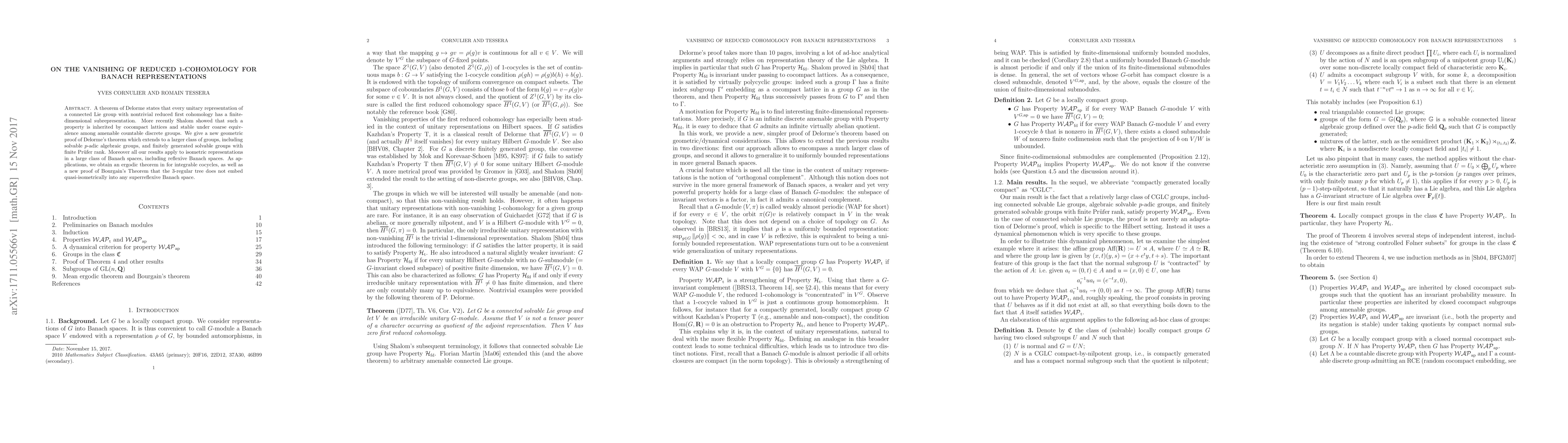 A theorem of Delorme states that every unitary representation of a connected Lie group with nontrivial reduced first cohomology has a finite-dimensional subrepresentation. More recently Shalom showed that such a property is inherited by cocompact lattices and stable under coarse equivalence among amenable countable discrete groups. We give a new geometric proof of Delorme's theorem which extends to a larger class of groups, including solvable $p$-adic algebraic groups, and finitely generated solvable groups with finite Pr\"ufer rank. Moreover all our results apply to isometric representations in a large class of Banach spaces, including reflexive Banach spaces. As applications, we obtain an ergodic theorem in for integrable cocycles, as well as a new proof of Bourgain's Theorem that the 3-regular tree does not embed quasi-isometrically into any superreflexive Banach space.