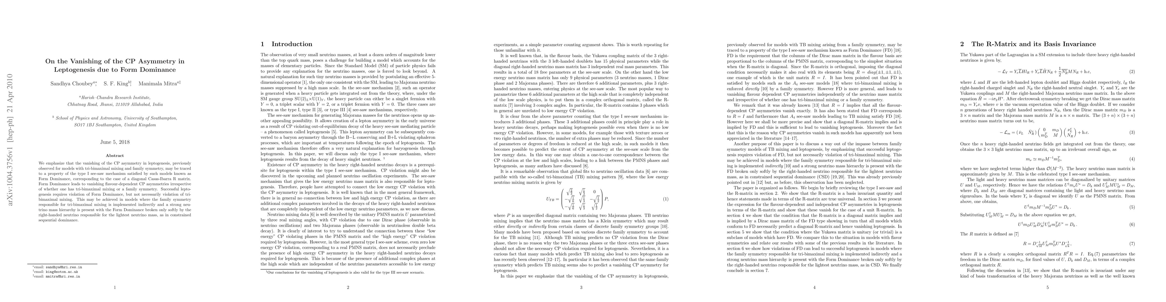 Leptogenesis models with tri-bimaximal mixing may exhibit vanishing CP asymmetry due to a property called Form Dominance. Violation of this dominance is necessary for successful leptogenesis.