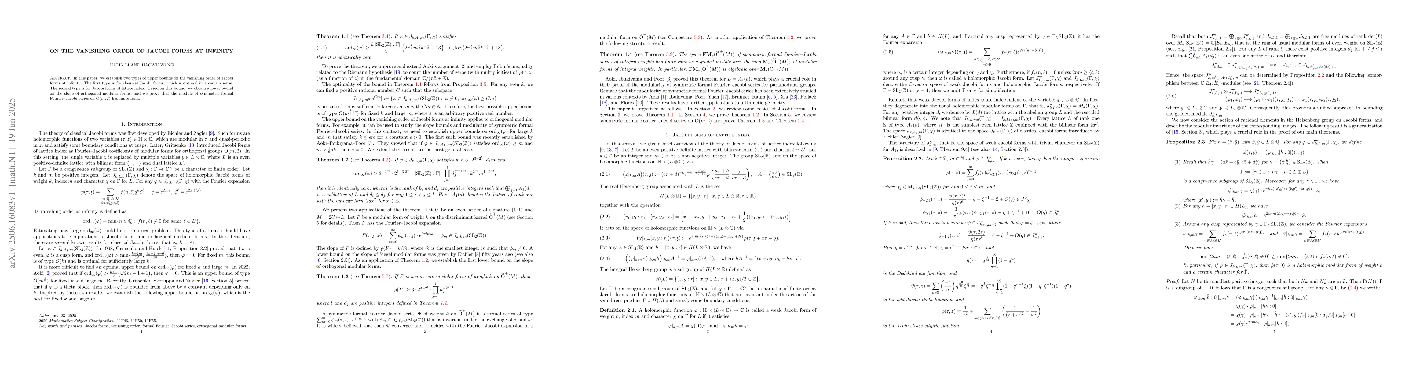 In this paper, we establish two types of upper bounds on the vanishing order of Jacobi forms at infinity. The first type is for classical Jacobi forms, which is optimal in a certain sense. The second type is for Jacobi forms of lattice index. Based on this bound, we obtain a lower bound on the slope of orthogonal modular forms, and we prove that the module of symmetric formal Fourier--Jacobi series on $\mathrm{O}(m,2)$ has finite rank.