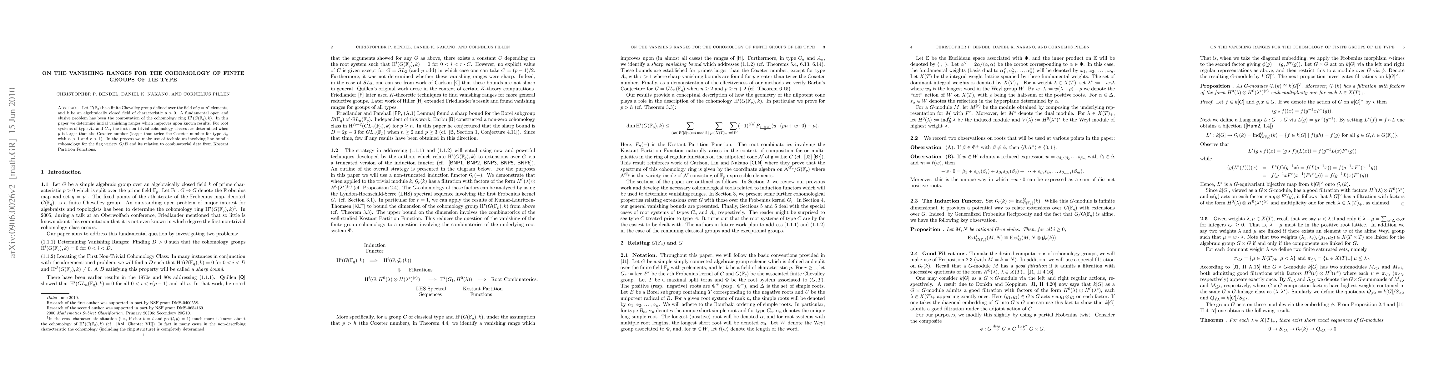 Let $G({\mathbb F}_{q})$ be a finite Chevalley group defined over the field of $q=p^{r}$ elements, and $k$ be an algebraically closed field of characteristic $p>0$. A fundamental open and elusive problem has been the computation of the cohomology ring $\opH^{\bullet}(G({\mathbb F}_{q}),k)$. In this paper we determine initial vanishing ranges which improves upon known results. For root systems of type $A_n$ and $C_n$, the first non-trivial cohomology classes are determined when $p$ is larger than the Coxeter number (larger than twice the Coxeter number for type $A_n$ with $n>1$ and $r >1$). In the process we make use of techniques involving line bundle cohomology for the flag variety $G/B$ and its relation to combinatorial data from Kostant Partition Functions.