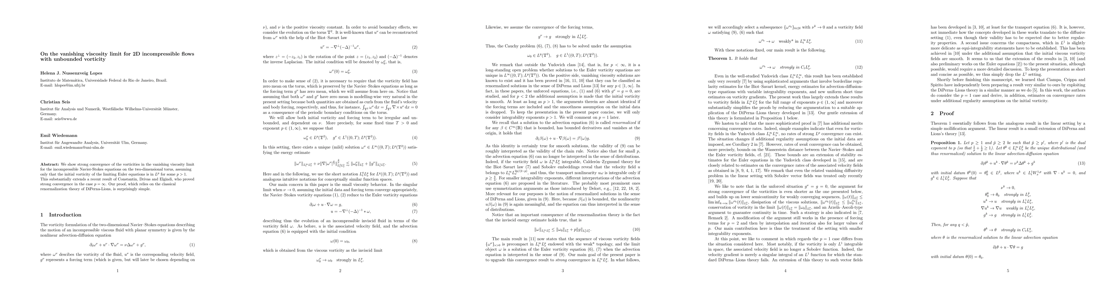 We show strong convergence of the vorticities in the vanishing viscosity limit for the incompressible Navier-Stokes equations on the two-dimensional torus, assuming only that the initial vorticity of the limiting Euler equations is in $L^p$ for some $p>1$. This substantially extends a recent result of Constantin, Drivas and Elgindi, who proved strong convergence in the case $p=\infty$. Our proof, which relies on the classical renormalization theory of DiPerna-Lions, is surprisingly simple.