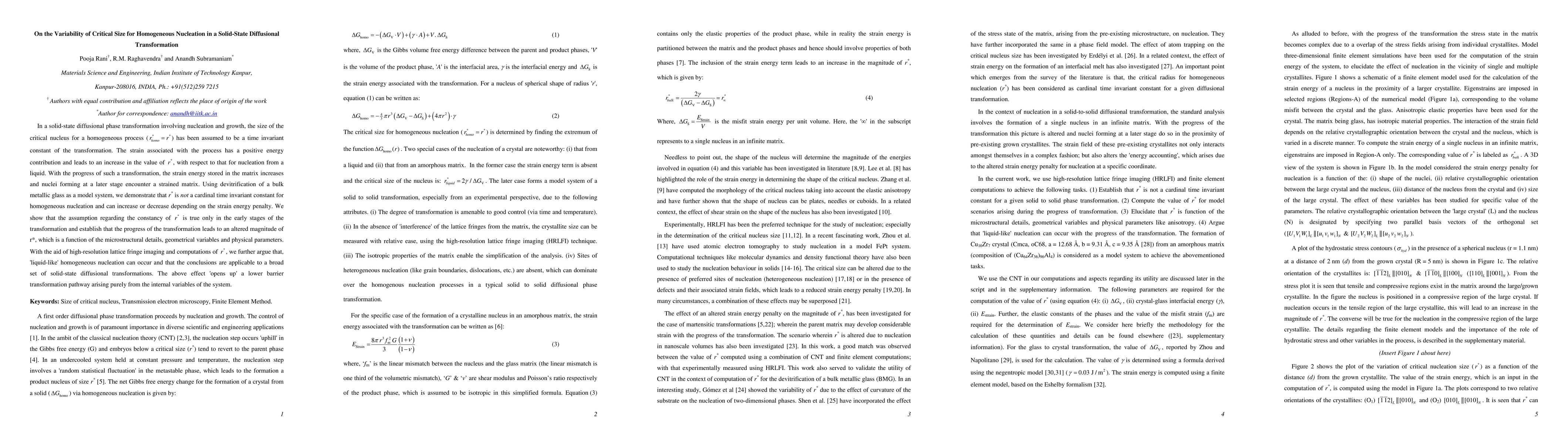 This paper demonstrates that the critical nucleus size (r*) for homogeneous nucleation in solid-state diffusional transformations is not a constant but varies with the strain energy stored in the matrix, challenging the traditional assumption. The findings, supported by high-resolution imaging and computations, suggest that 'liquid-like' nucleation can occur and propose a new transformation pathway influenced by the system's internal variables.