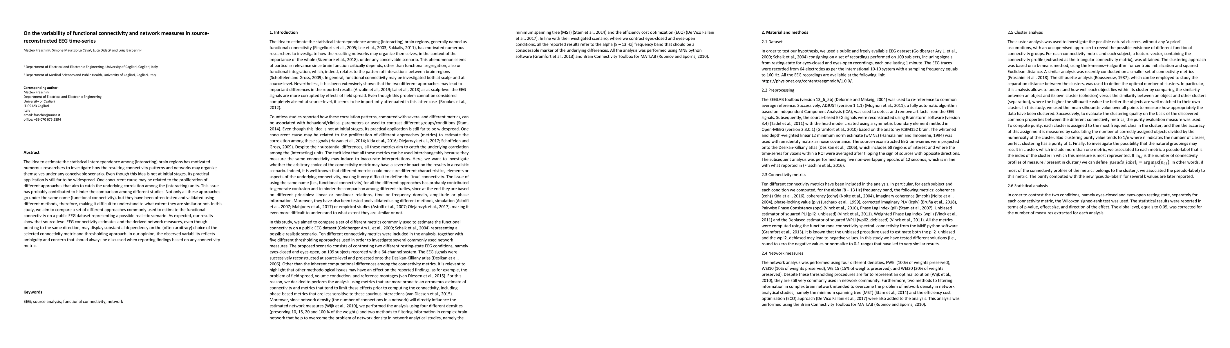 A study compared different approaches to estimate functional connectivity in EEG data, finding that results vary significantly depending on chosen metric and thresholding approach. This highlights the need for caution when interpreting connectivity metrics.