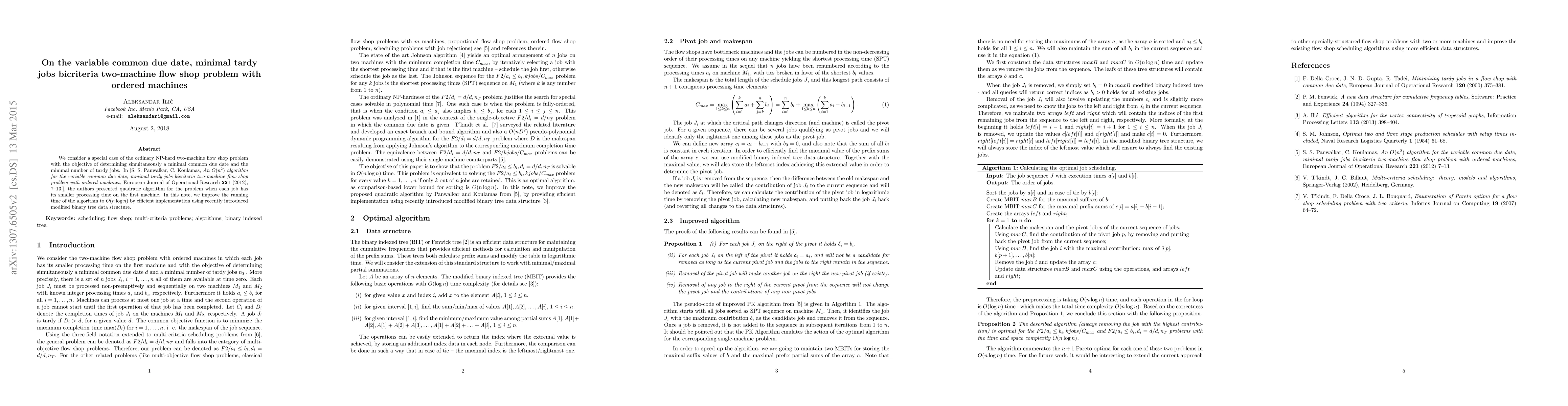 This paper presents an improved algorithm for solving the bicriteria two-machine flow shop scheduling problem, aiming to minimize both the common due date and the number of tardy jobs. The authors enhance the running time from O(n^2) to O(n log n) using a modified binary tree data structure.