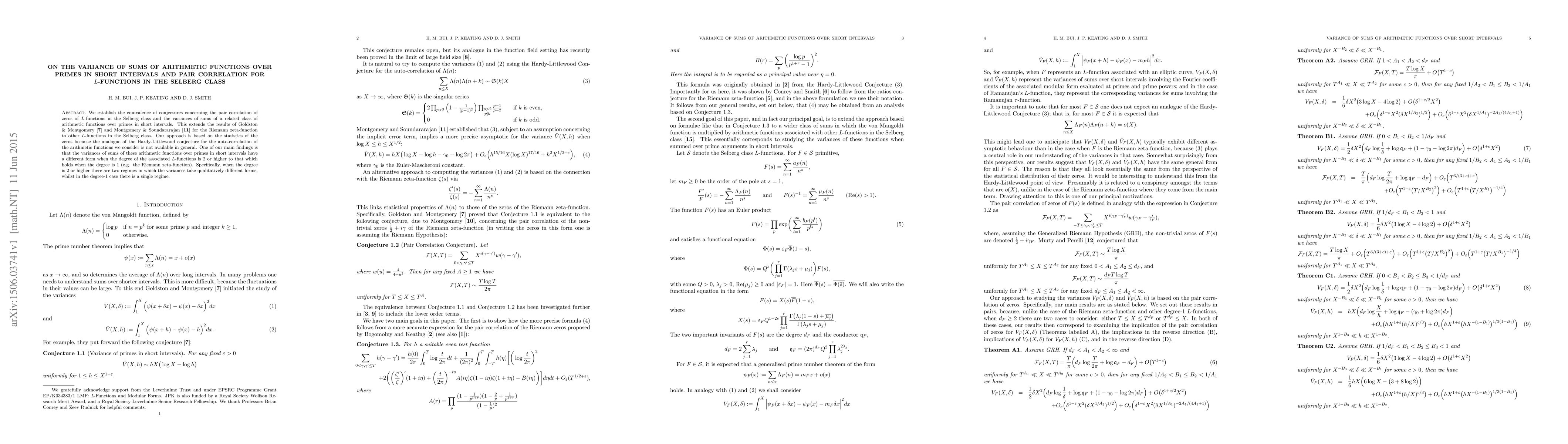 We establish the equivalence of conjectures concerning the pair correlation of zeros of $L$-functions in the Selberg class and the variances of sums of a related class of arithmetic functions over primes in short intervals. This extends the results of Goldston & Montgomery [7] and Montgomery & Soundararajan [11] for the Riemann zeta-function to other $L$-functions in the Selberg class. Our approach is based on the statistics of the zeros because the analogue of the Hardy-Littlewood conjecture for the auto-correlation of the arithmetic functions we consider is not available in general. One of our main findings is that the variances of sums of these arithmetic functions over primes in short intervals have a different form when the degree of the associated $L$-functions is 2 or higher to that which holds when the degree is 1 (e.g. the Riemann zeta-function). Specifically, when the degree is 2 or higher there are two regimes in which the variances take qualitatively different forms, whilst in the degree-1 case there is a single regime.