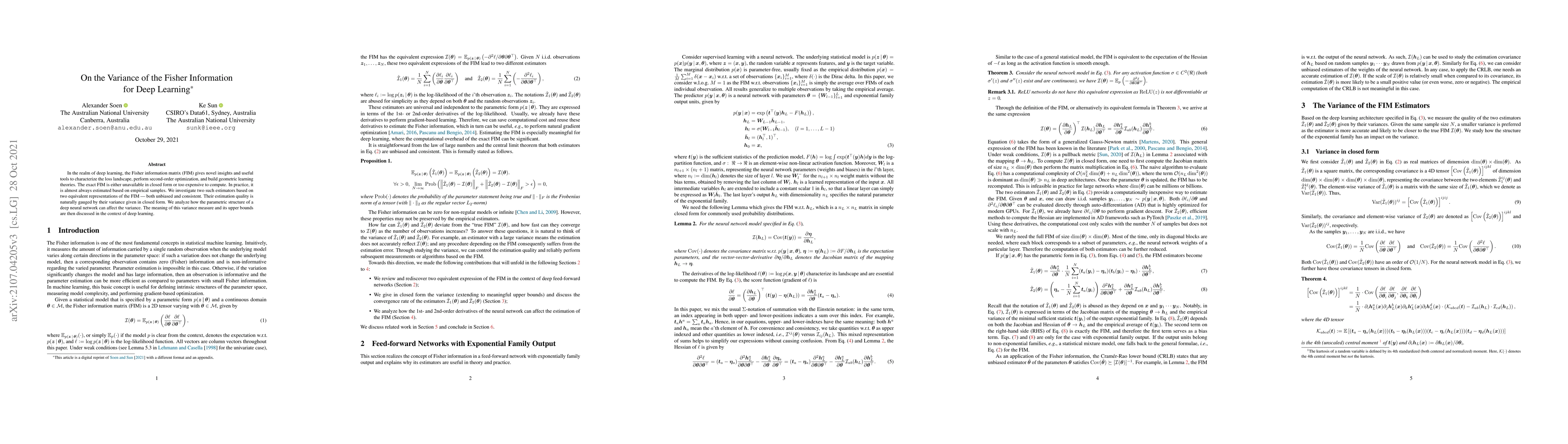 This paper examines two unbiased and consistent estimators for the Fisher information matrix in deep learning, providing closed-form variance expressions. It analyzes how the parametric structure of deep neural networks influences these variances and discusses their implications for loss landscape characterization and optimization.