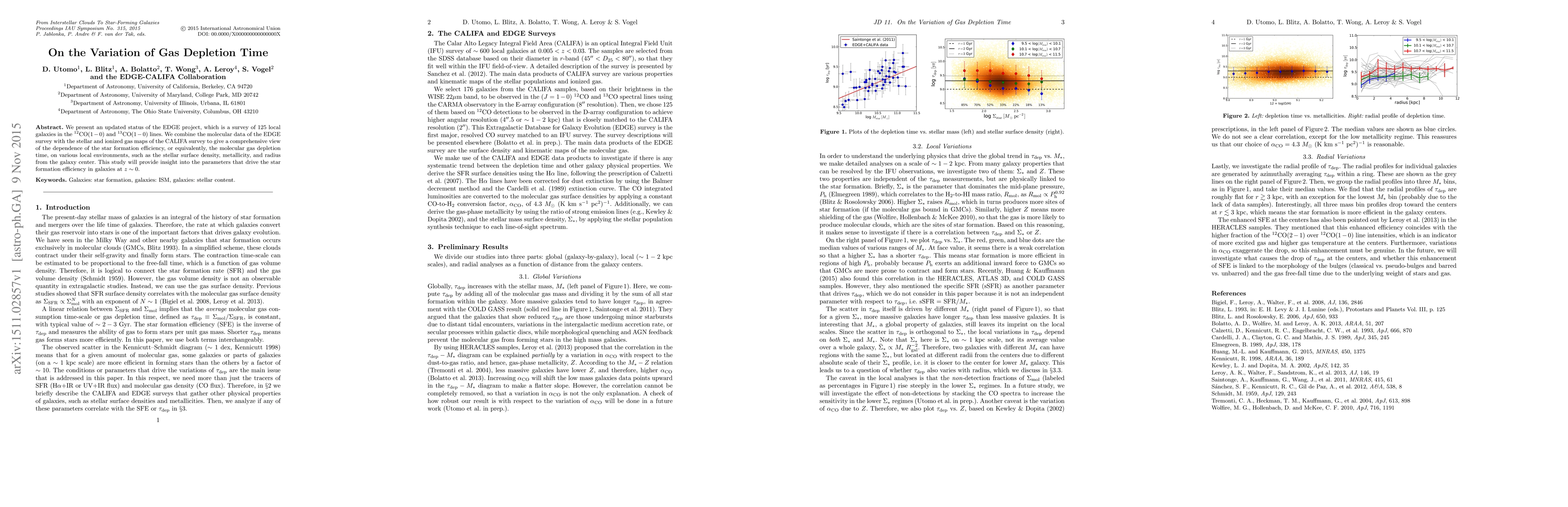 We present an updated status of the EDGE project, which is a survey of 125 local galaxies in the $^{12}$CO($1-0$) and $^{13}$CO($1-0$) lines. We combine the molecular data of the EDGE survey with the stellar and ionized gas maps of the CALIFA survey to give a comprehensive view of the dependence of the star formation efficiency, or equivalently, the molecular gas depletion time, on various local environments, such as the stellar surface density, metallicity, and radius from the galaxy center. This study will provide insight into the parameters that drive the star formation efficiency in galaxies at $z \sim 0$.