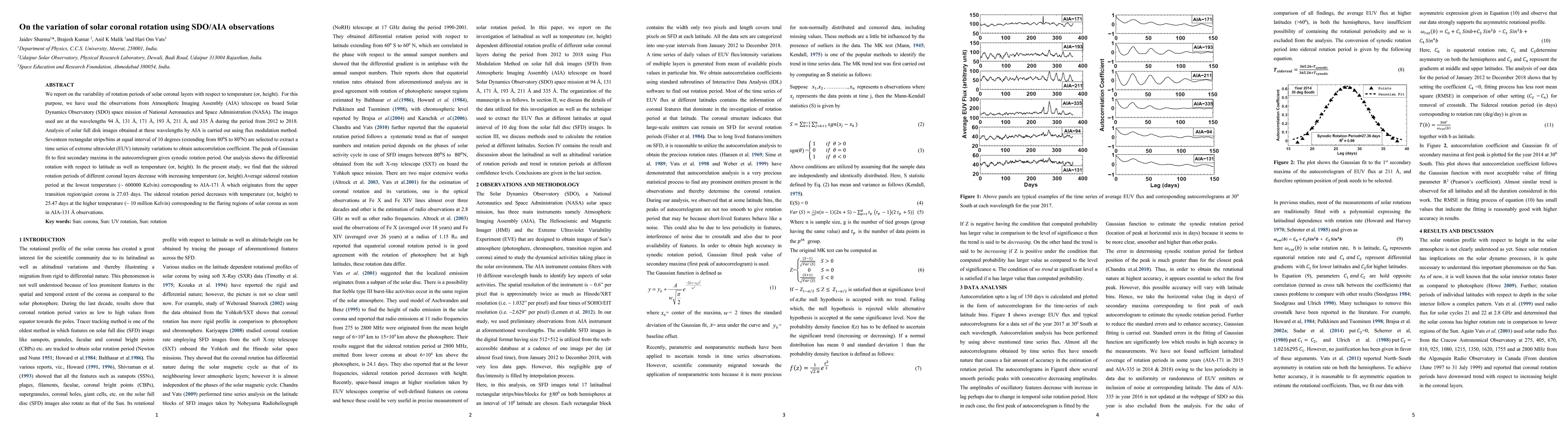 This study analyzes solar coronal rotation variability using SDO/AIA observations, revealing differential rotation with respect to both latitude and temperature. The sidereal rotation period decreases from 27.03 days at lower temperatures (~600000 K) to 25.47 days at higher temperatures (~10 million K).