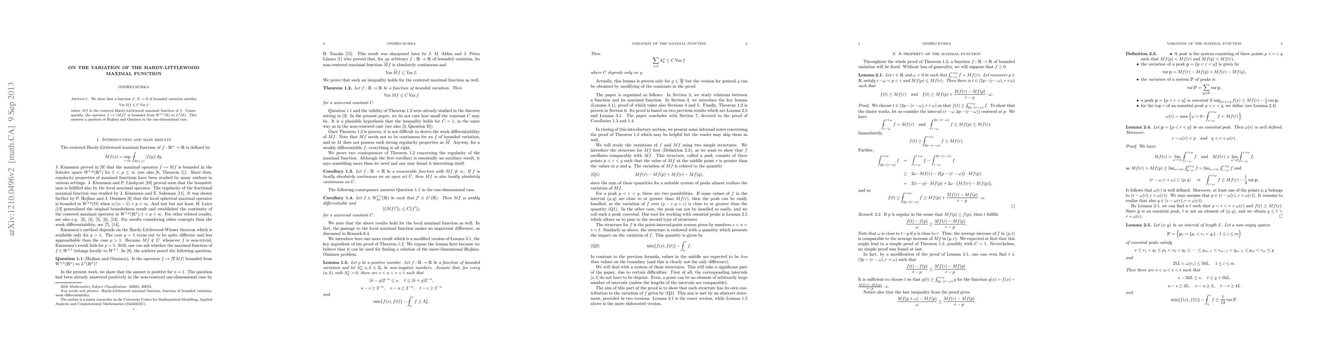 This paper demonstrates that a function of bounded variation satisfies a bound on its Hardy-Littlewood maximal function, showing that the operator mapping $f$ to $(Mf)'$ is bounded from $W^{1,1}(\mathbb{R})$ to $L^{1}(\mathbb{R})$. This resolves a question posed by Hajlasz and Onninen in the one-dimensional context.