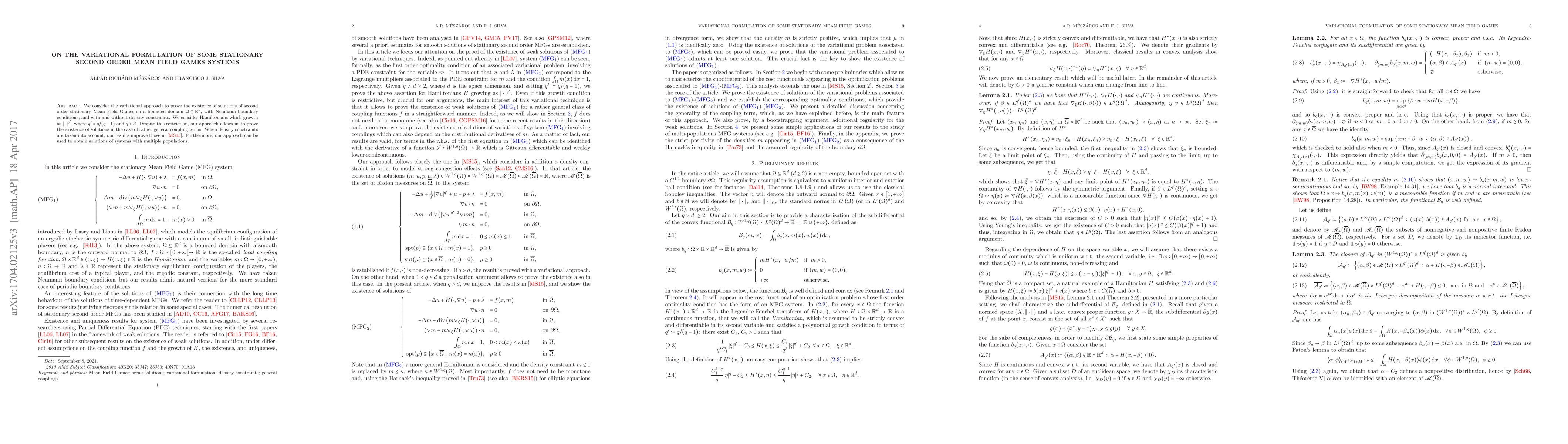We consider the variational approach to prove the existence of solutions of second order stationary Mean Field Games on a bounded domain $\Omega\subseteq \mathbb{R}^{d}$, with Neumann boundary conditions, and with and without density constraints. We consider Hamiltonians which growth as $|\cdot|^{q'}$, where $q'=q/(q-1)$ and $q>d$. Despite this restriction, our approach allows us to prove the existence of solutions in the case of rather general coupling terms. When density constraints are taken into account, our results improve those in \cite{MesSil}. Furthermore, our approach can be used to obtain solutions of systems with multiple populations.